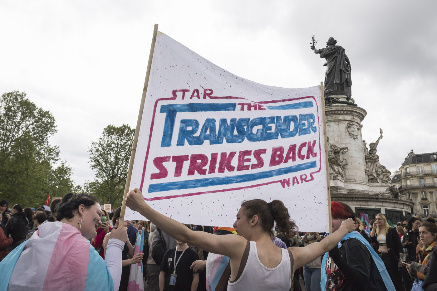 France, Paris, 2024-05-05. La manifestation du 5 mai à Paris place de la République, à l appel de la communauté LGBTQI+ pour la défense des droits des personnes transgenres et le droit à disposer de son corps. Photographie de Pascal SONNET / Hans Lucas.