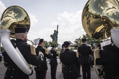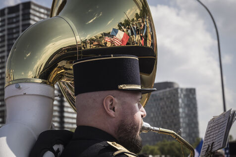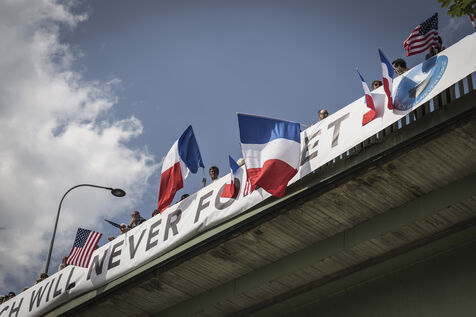 France, Paris, 2024-06-06. The association "The French Will Never Forget", for Franco-American friendship, organized a ceremony on the Pont de Grenelle in Paris on Thursday June 6, 2024, for the 80th anniversary of D-Day. Photograph by Pascal SONNET / Hans Lucas.