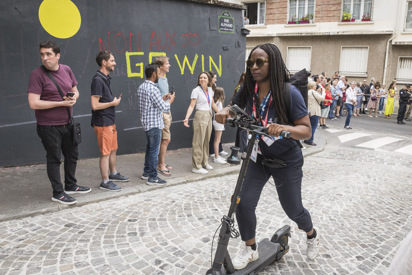 France, Paris, 2024-07-15. Lundi 15 juillet 2024, la flamme olympique passe par la rue Alphand dans le 13eme arrondissement de Paris. Photographie de Pascal SONNET / Hans Lucas.