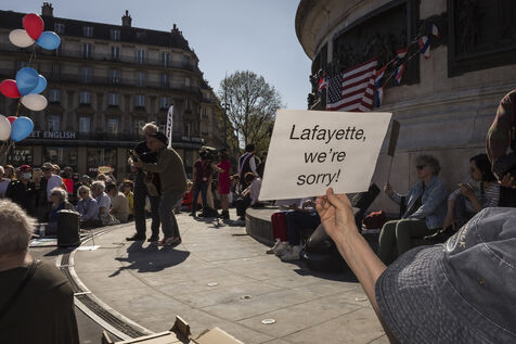 France, Paris, 2025-04-05. Faced with Trump and his contempt for international law, hundreds of thousands of Americans are taking to the streets in the United States of America. In support of this action, Americans in France are demonstrating at Place de la République in Paris, under the slogan “Hands Off”. Photograph by Pascal SONNET / Hans Lucas.