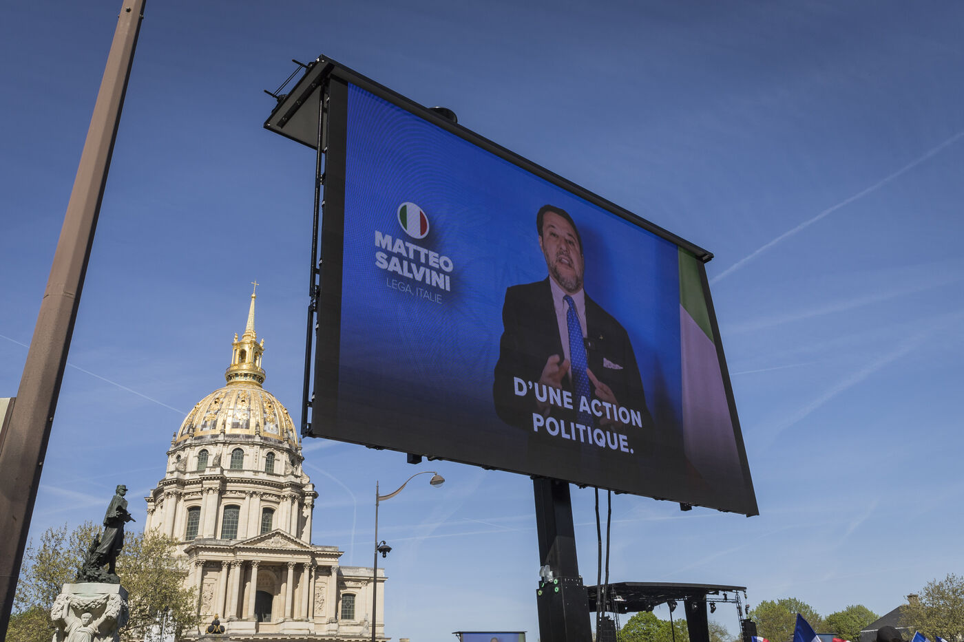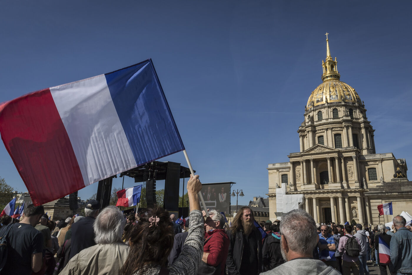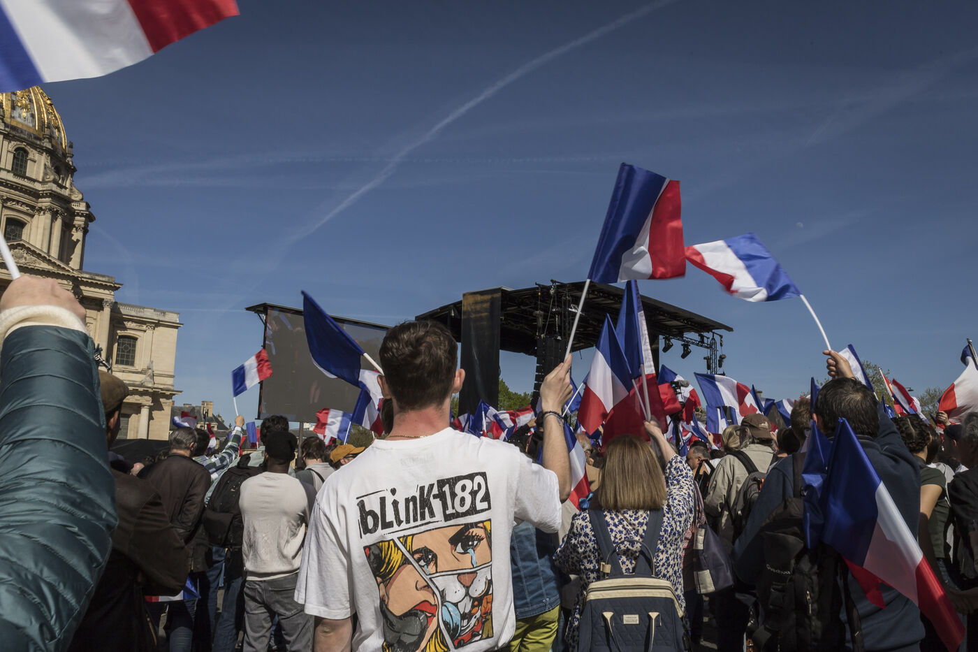France, Paris, 2025-04-06. Les partisans du Rassemblement National se sont réunis ce dimanche 6 avril 202, pour soutenir Marine Le Pen après sa condamnation pour détournement de fonds publics. Photographie de Pascal SONNET / Hans Lucas.
