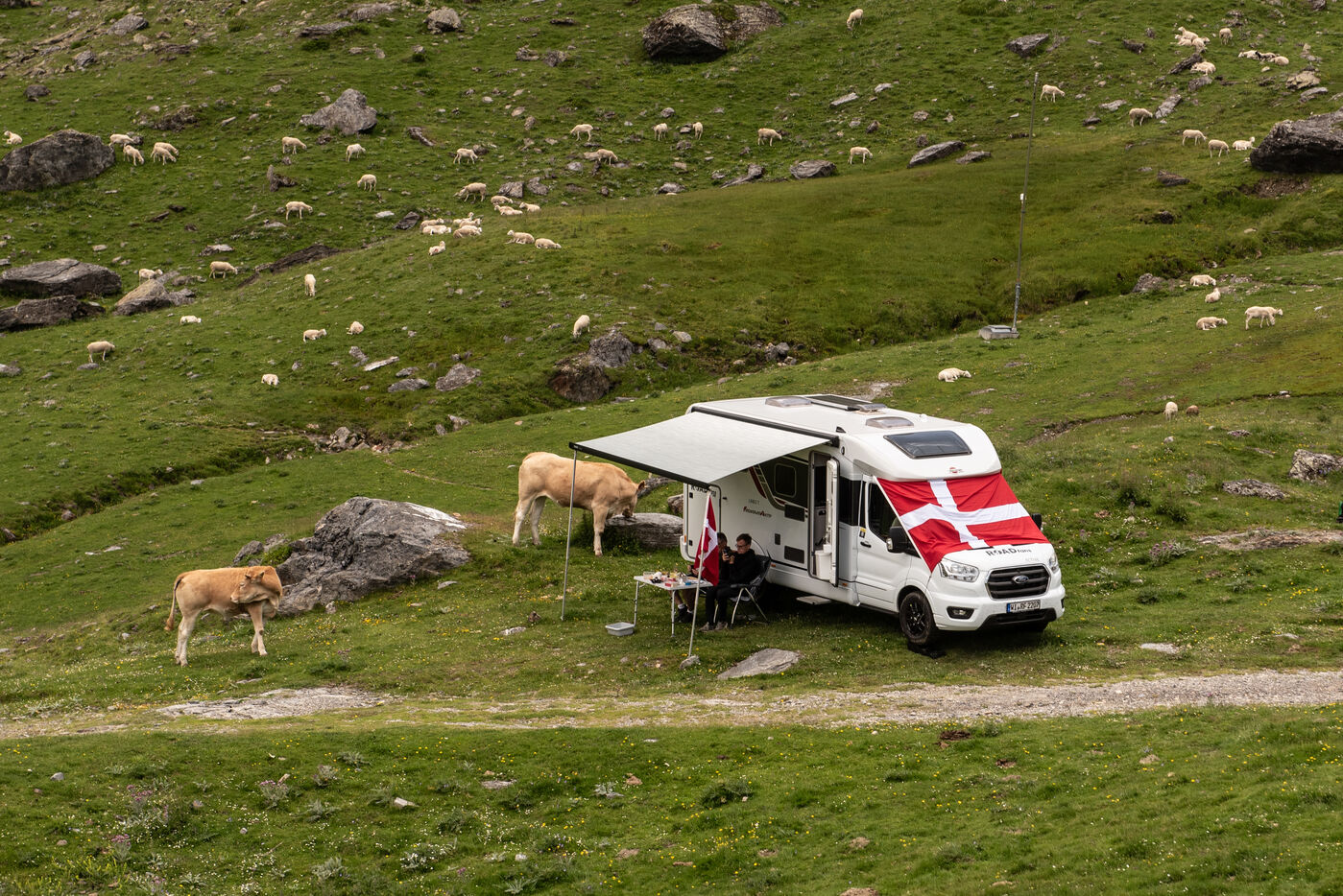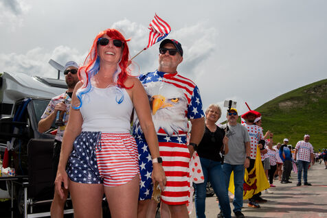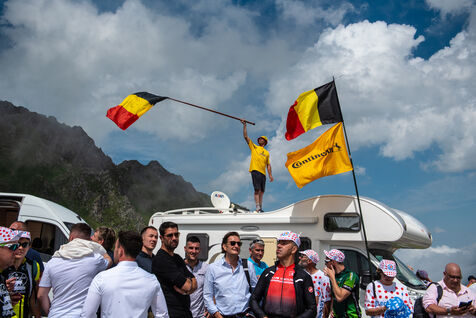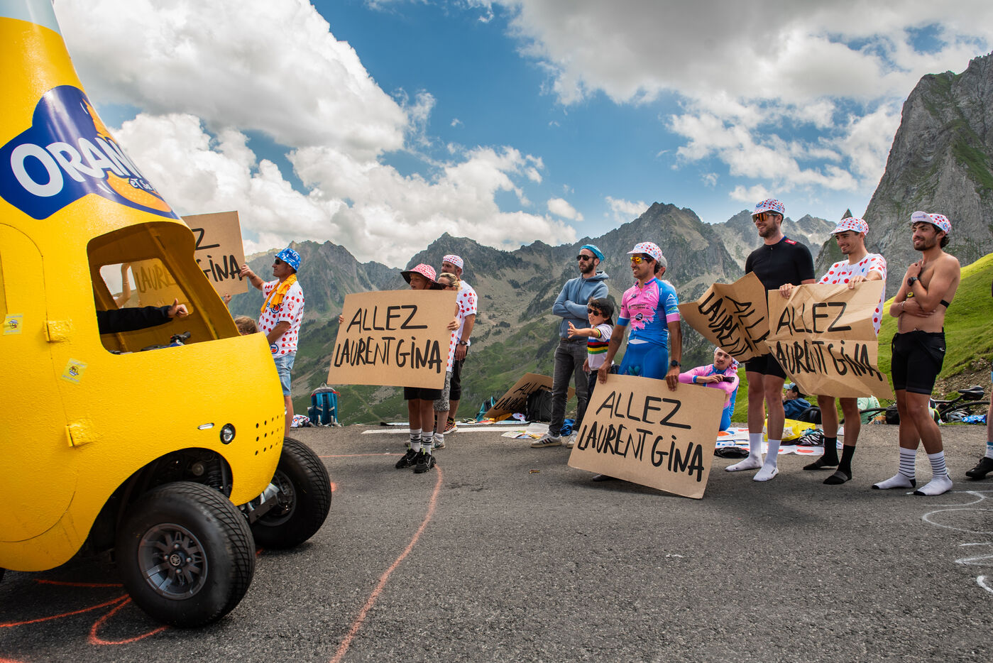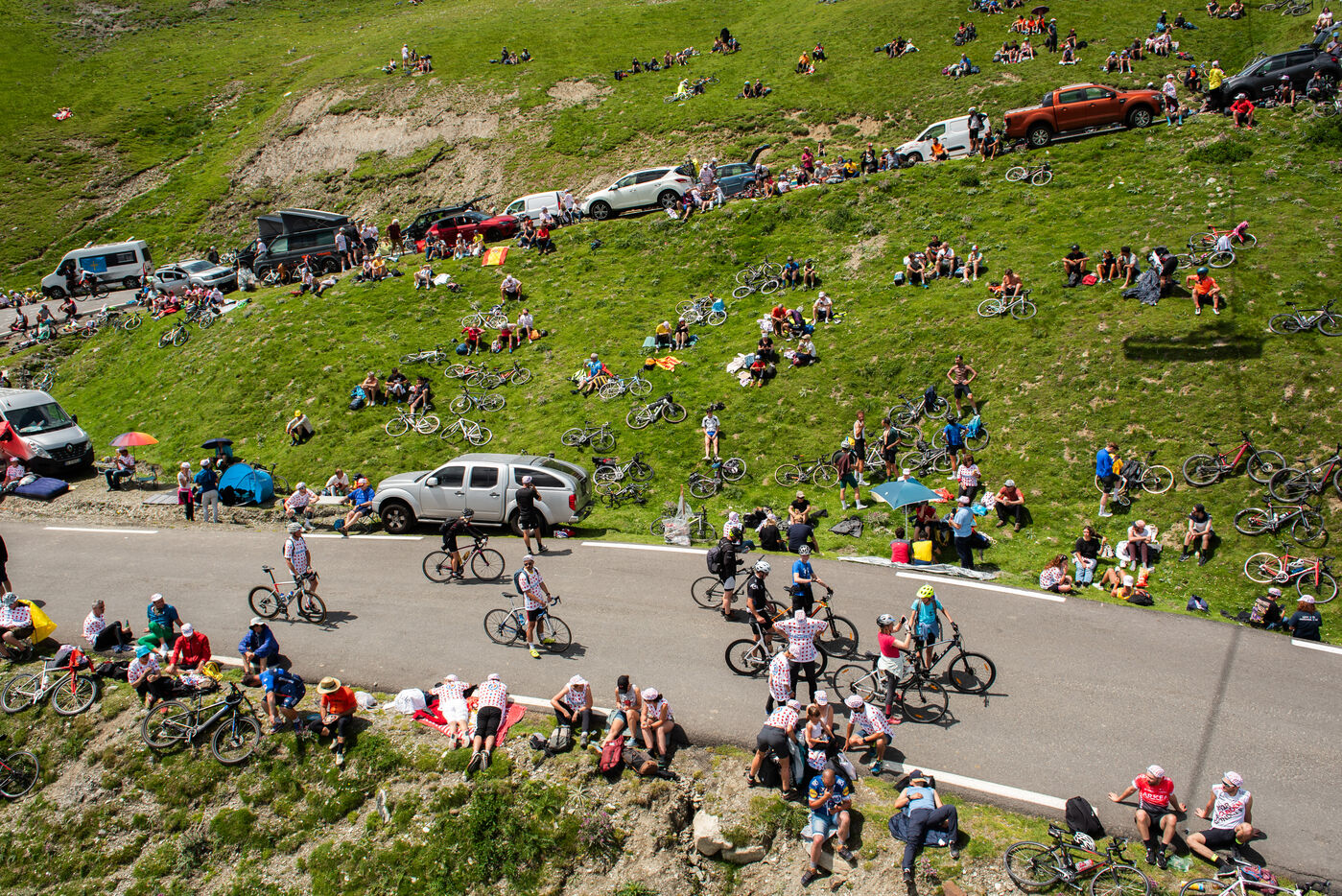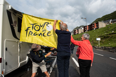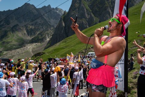 On 6 July 2023, many spectators are waiting for the cyclists and the advertising caravan on the Col du Tourmalet in the Pyrenees for the sixth stage of the Tour de France. Some of them have been on site for several days to secure the best position to watch this legendary mountain stage live. Tents and motor homes transform the pass. Here, cycling fans mix with party goers and eccentrics who hoping to grab the media's attention. For a day where everything seems allowed, young and old of different nationalities cohabit to take part in the show.