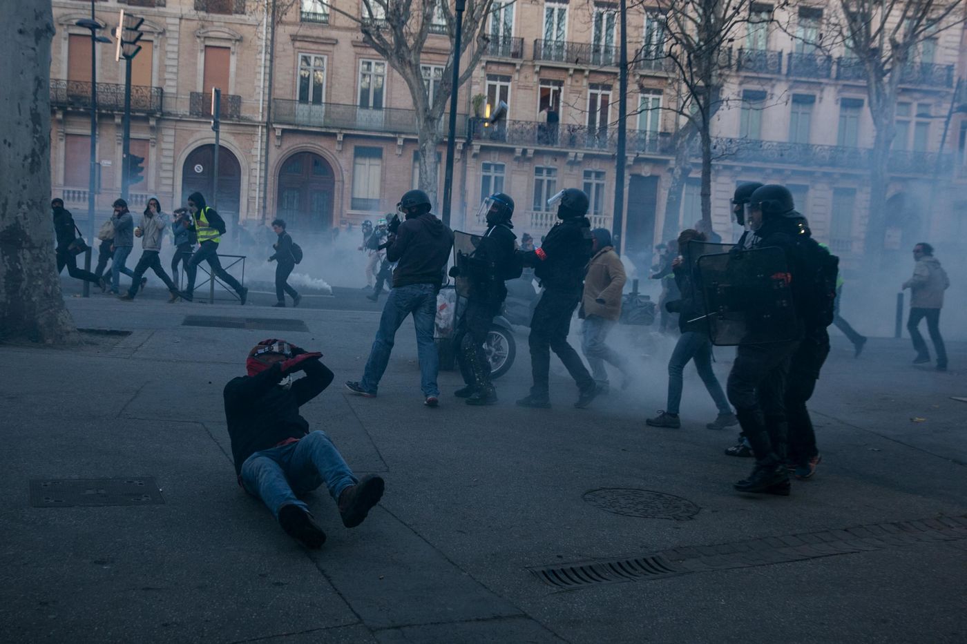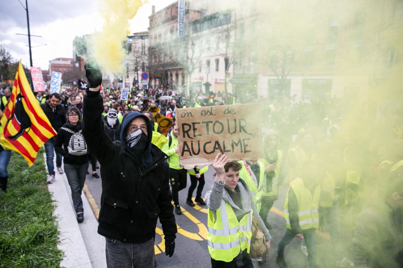 Manifestations des gilets jaunes le 02 Mars 2019 dans le cadre de l'acte XVI de leur mouvement. A Toulouse, une manifestation réunissant plusieurs milliers de personnes s'élance pacifiquement dans les rues de la ville jusqu'à ce que des échauffourées éclatent dans le centre.