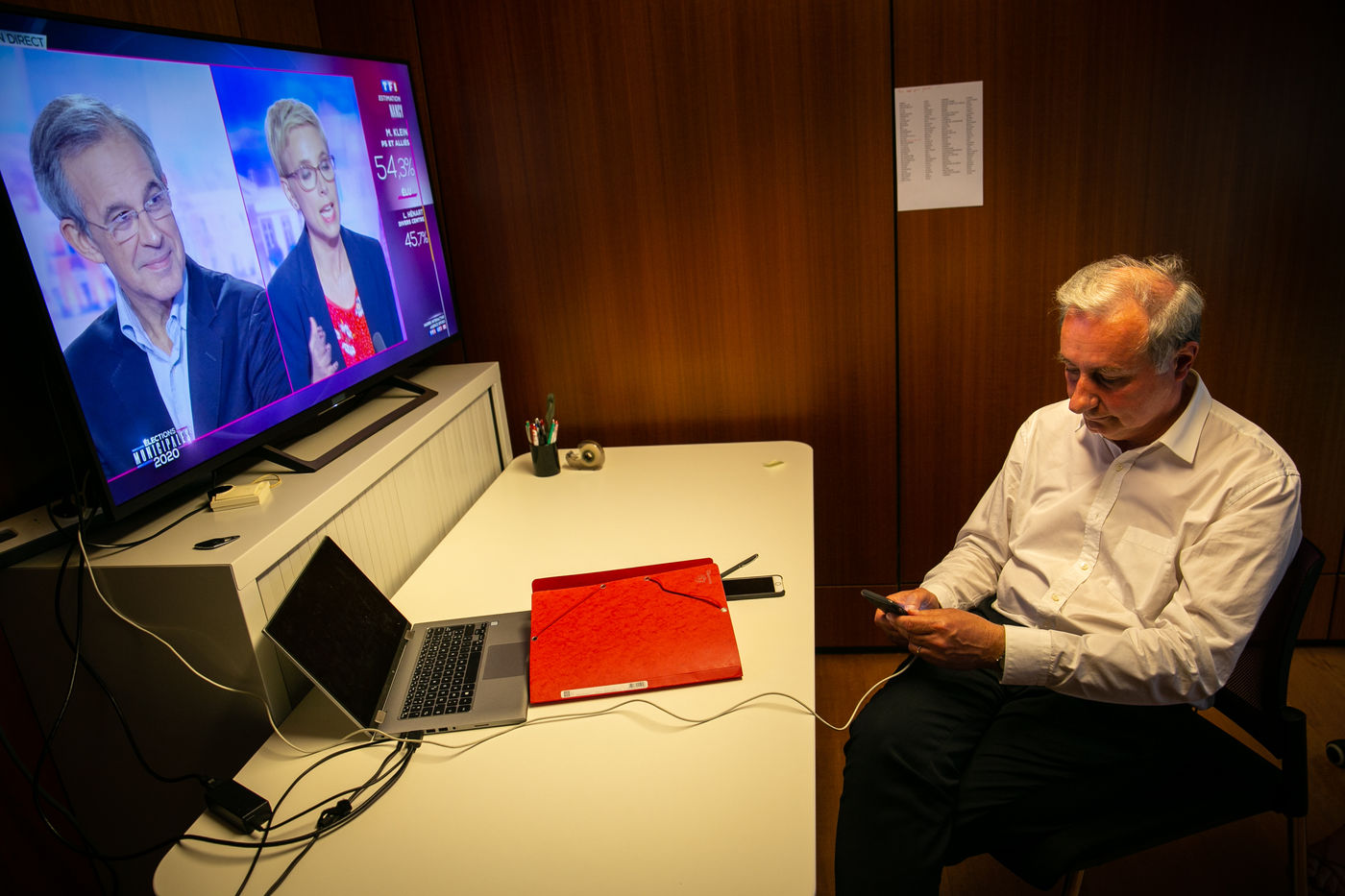 A Toulouse, le maire, Jean-Luc Moudenc (LR - Aimer Toulouse - LREM) - réélu avec 52% des suffrages exprimés - attend les résultats du second tour des élections municipales dans un salon privé en compagnie de ses deux filles, Estelle Moudenc et sa soeur, 28 juin 2020.