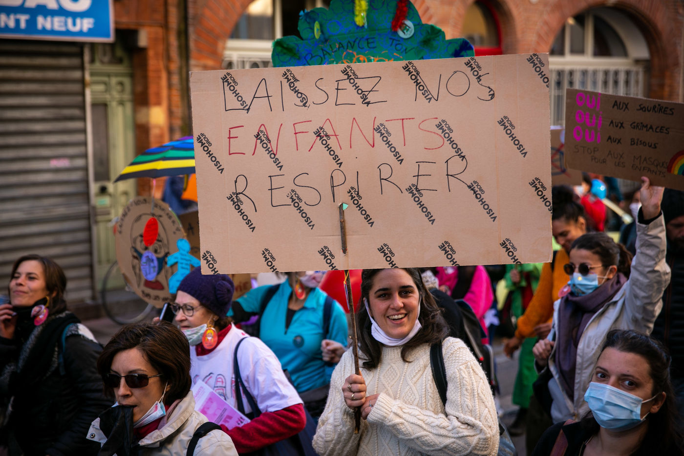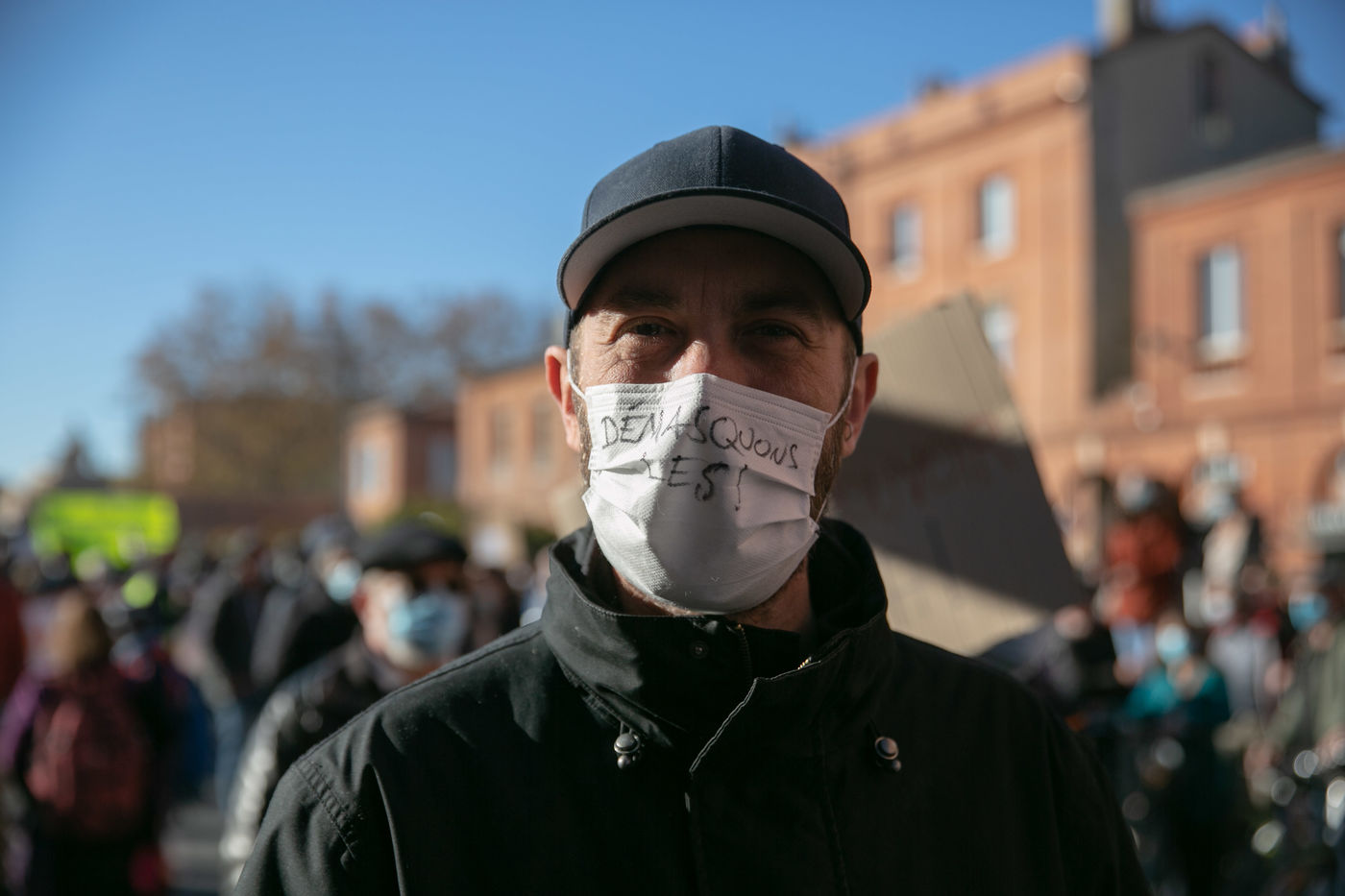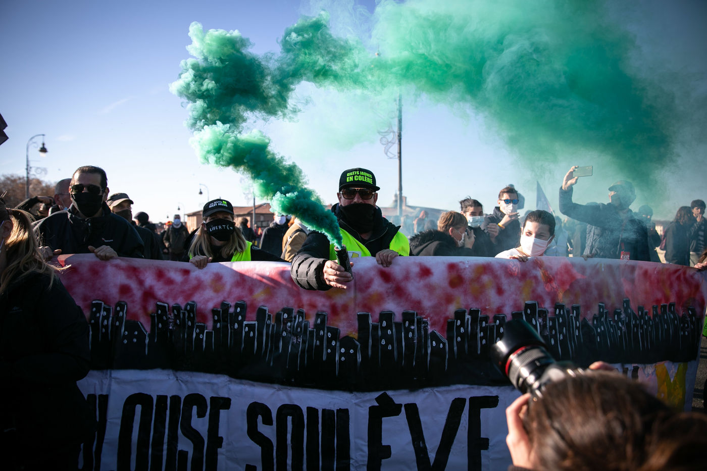 En plein confinement, plusieurs milliers de personnes ont manifesté à Toulouse contre la politique sanitaire du gouvernement, la loi dite de "sécurité globale" et pour demander plus de moyens pour l'hôpital public, 21 novembre 2020.