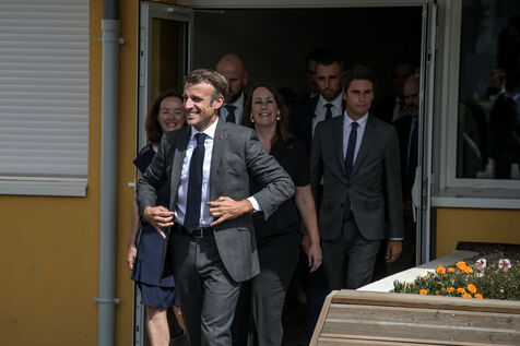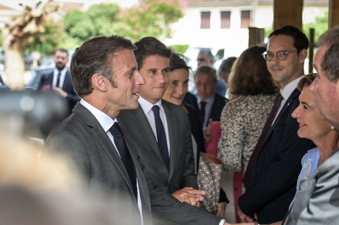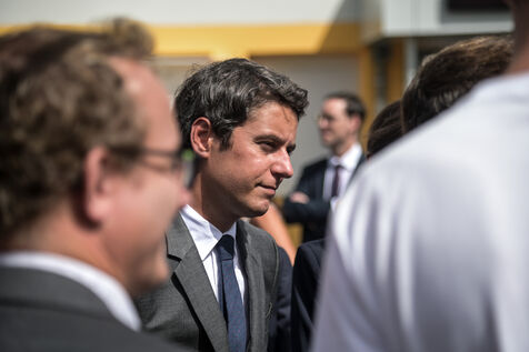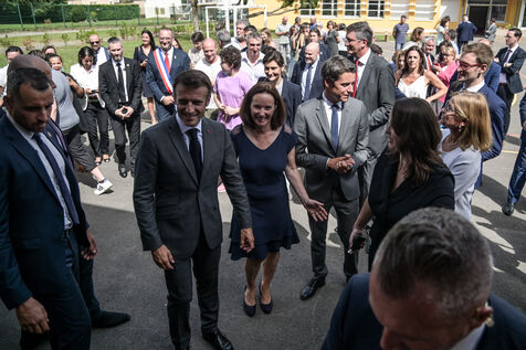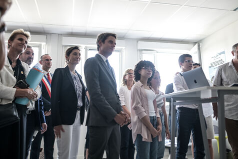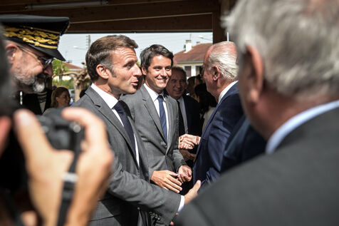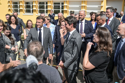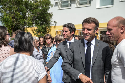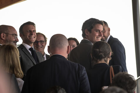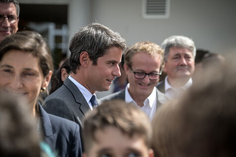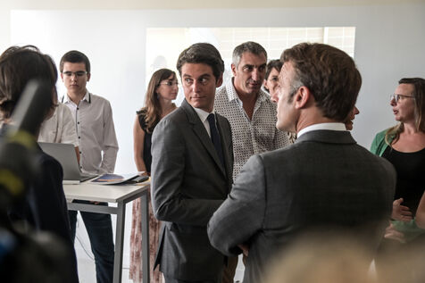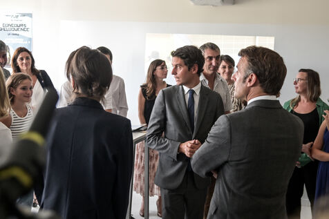 Il est accompagné du ministre de l?Éducation nationale, Gabriel Attal ; de la ministre des Sports, Amélie Oudéa-Castéra, et du maire de Pau, François Bayrou, secrétaire général du Conseil national de la refondation.