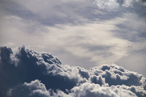 Des nuages dans le ciel de Pau, Pyrénées Atlantiques. Ciel menaçant, nuages noirs et nuages blancs. La grisaille d'un ciel de plomb. Les cumulus, stratus et cirrus. La pluie arrive et le soleil se cache. Paysage onirique qui inspire la rêverie. Dans les cieux les rêves ne sont pas loin. L'imagination et le réel au service de la douceur de vivre. La plénitude n'est jamais loin dans les nuées bleues. L'olympe, le pays des dieux assis sur des cumulonimbus moelleux. Un ciel de rage ou un ciel d'orage. L'évanescence de l'esprit. La spiritualité pour du réconfort. Se changer les idées et croire en ses rêves. La distance est relativité. La pollution de l'air pur et de l'atmosphère est dû au rejet du Co2 et cause des problèmes de respiration.
