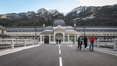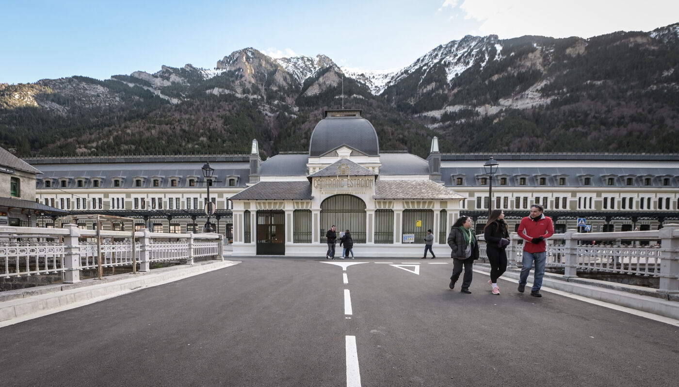 Spain, Canfranc, 2023-01-14. The "White Train" bound for Canfranc station carries 400 passengers. This convoy of nine historic carriages, departing from Madrid, is a symbol for the town of Canfranc, which wants to forge a new railway destiny for itself. The former station has been converted into a luxury hotel: Canfranc Estación. The town is a base for skiers and tourists, with the winter resorts of Astún and Candanchú close by.