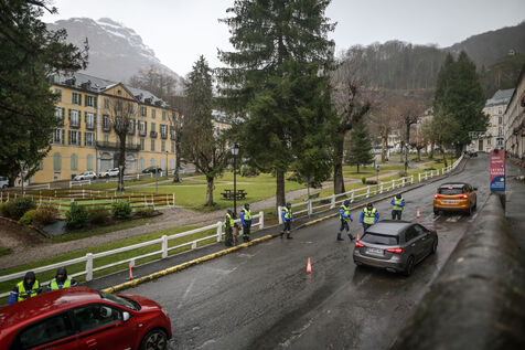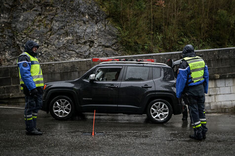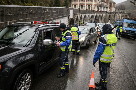 Operation de gendarmerie sur la route de la station de ski Gourette. Les gendarmes contrôle les équipements obligatoires qui doivent être présents dans le véhicules (pneus neige, chaînes, chaussettes). La loi montagne est en vigueur pour la troisième année consécutive, du 1er novembre 2023 au 31 mars 2024. C'est la dernière saison pendant laquelle les pneus marqués de la mention M+S ou 3PMSF sont considérés comme des pneus hiver. Au 1er novembre 2024, seul les sigles M+S ET 3PMSF seront valides.