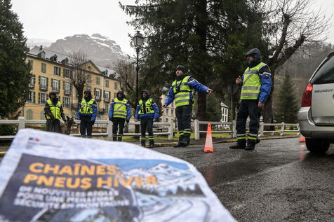 Gendarmerie operation on the road to the Gourette ski resort. The gendarmes check the compulsory equipment that must be in the vehicle (snow tyres, chains, socks). The mountain law is in force for the third year running, from 1 November 2023 to 31 March 2024. This is the last season during which tyres marked M+S or 3PMSF are considered to be winter tyres, and on 1 November 2024 only M+S and 3PMSF will be valid.