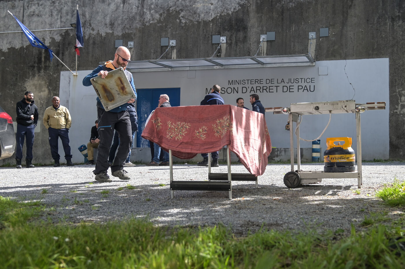Au lendemain du sanglant guet-apens d'un fourgon de la pénitentiaire au péage d'Incarville, dans l'Eure, de nombreuses mobilisations sont organisées ce mercredi matin devant les prisons en France. Des agents de la prison de Pau ont observé une minute de silence dans les murs de la maison d'arrêt avant de se mobiliser devant l'entrée pour un déjeuner improvisé.