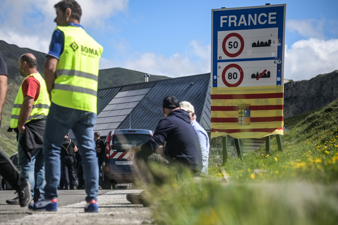 France, Col du Pourtalet, 2024-06-03. Les agriculteurs français et espagnols ont débuté une action coordonnée des deux côtés de la frontière entre la France et l'Espagne au col du Pourtalet dans les Pyrénées Atlantiques. Plusieurs dizaines de paysans espagnols (en gilets jaunes) et un peu moins de leurs homologues français (casquettes jaunes) étaient présents ce lundi matin. Au programme: blocage de la circulation des poids lourds, filtrage des voitures, barbecue. Le mouvement de contestation devrait durer 24h. Ils dénoncent les contraintes européennes et ce qu?ils estiment être des promesses non tenues par le gouvernement français. La CR 64 réclame toujours le GNR à 1 euro TTC.