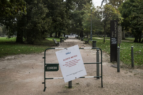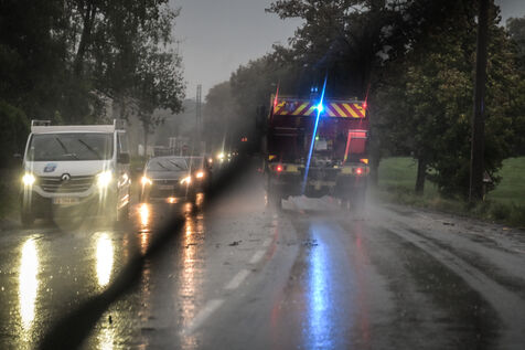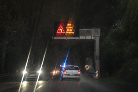 Storm Kirk hits France and the Atlantic Pyrenees, bringing torrential rain and violent winds that disrupt traffic and force the closure of many parks. Under powerful gusts, motorists and pedestrians struggled against the bad weather, creating a dark and dramatic atmosphere in the streets. Safety signs warned residents of the risks associated with the gusts of wind, while vehicles struggled to make headway in the torrential rain. Flooded road, rain, weather warning
