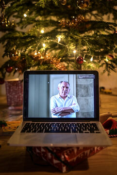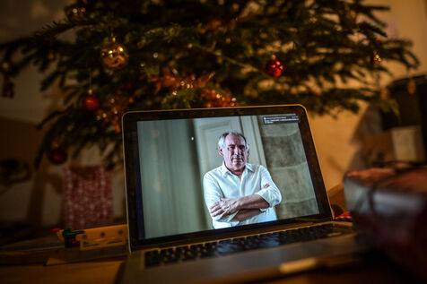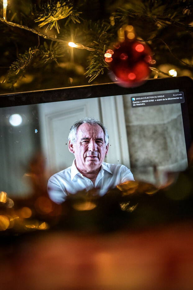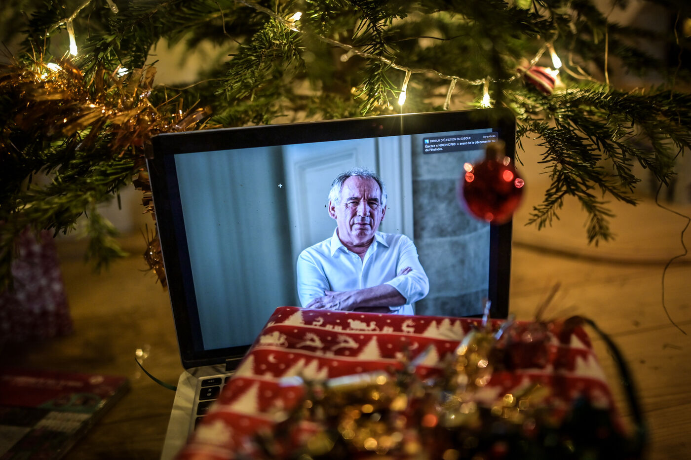 Staged portrait of Francois Bayrou and Emmanuel Macron on a computer screen placed at the foot of the Christmas tree like a gift from Santa Claus, in Pau on December 13, 2024. Michel Barnier's government was overthrown by a motion of censure supported by the extreme right and the left. Emmanuel Macron must appoint a new Prime Minister capable of gathering a majority and getting the 2025 budget adopted