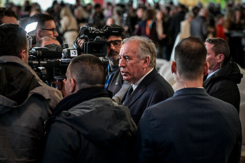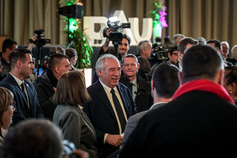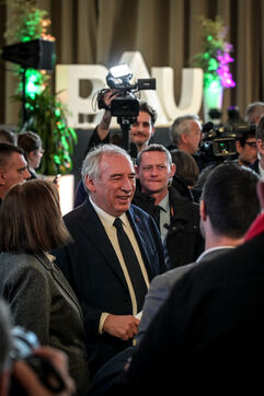 François Bayrou, mayor of Pau, president of the Pau Bearn Pyrenees urban community, president of the communal center of Social Action and prime minister presents his wishes to municipal staff in the ballroom of the Palais Beaumont in Pau on January 20, 2024. Here taking selfies with municipal agents. An illustration of the accumulation of mandates and the omnipresence of the politician in Paris and in the provinces. Here in an interview with national and local media.