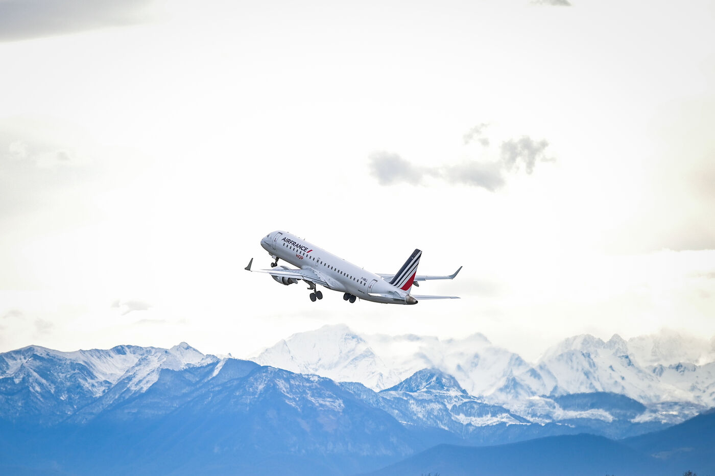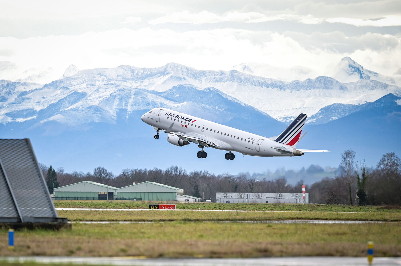A plane from the Air France HOP company takes off on the tarmac of Pau Pyrenees airport in Uzein on January 29, 2025. Gaining altitude above the snow-capped mountains of the Pyrenees and the Pic du Midi d'Ossau, the aircraft, an Embraer E 190, is captured in full flight in a bright sky, with a backdrop of snow-covered peaks. An illustration of short and medium-haul flights or connections, flights to reach Paris from the territories or the province.