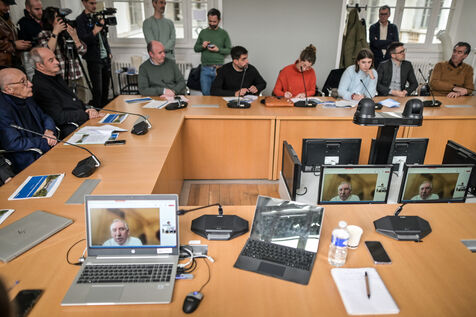 In the meeting room of the Pau town hall Francois Bayrou presents remotely in visionconference the project to revegetate the central square of the city, Place Clemenceau in Pau on February 8, 2024. An image that can illustrate the accumulation of mandates, the omnipresence of the Prime Minister. The latter refused to answer questions concerning the right of the soil and the Betharram scandal. On the other hand, he reacted to the remarks of the point which speaks of "whim" when it evokes the pressures made by Bayrou towards Air France concerning the Pau Orly line