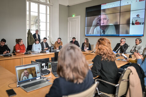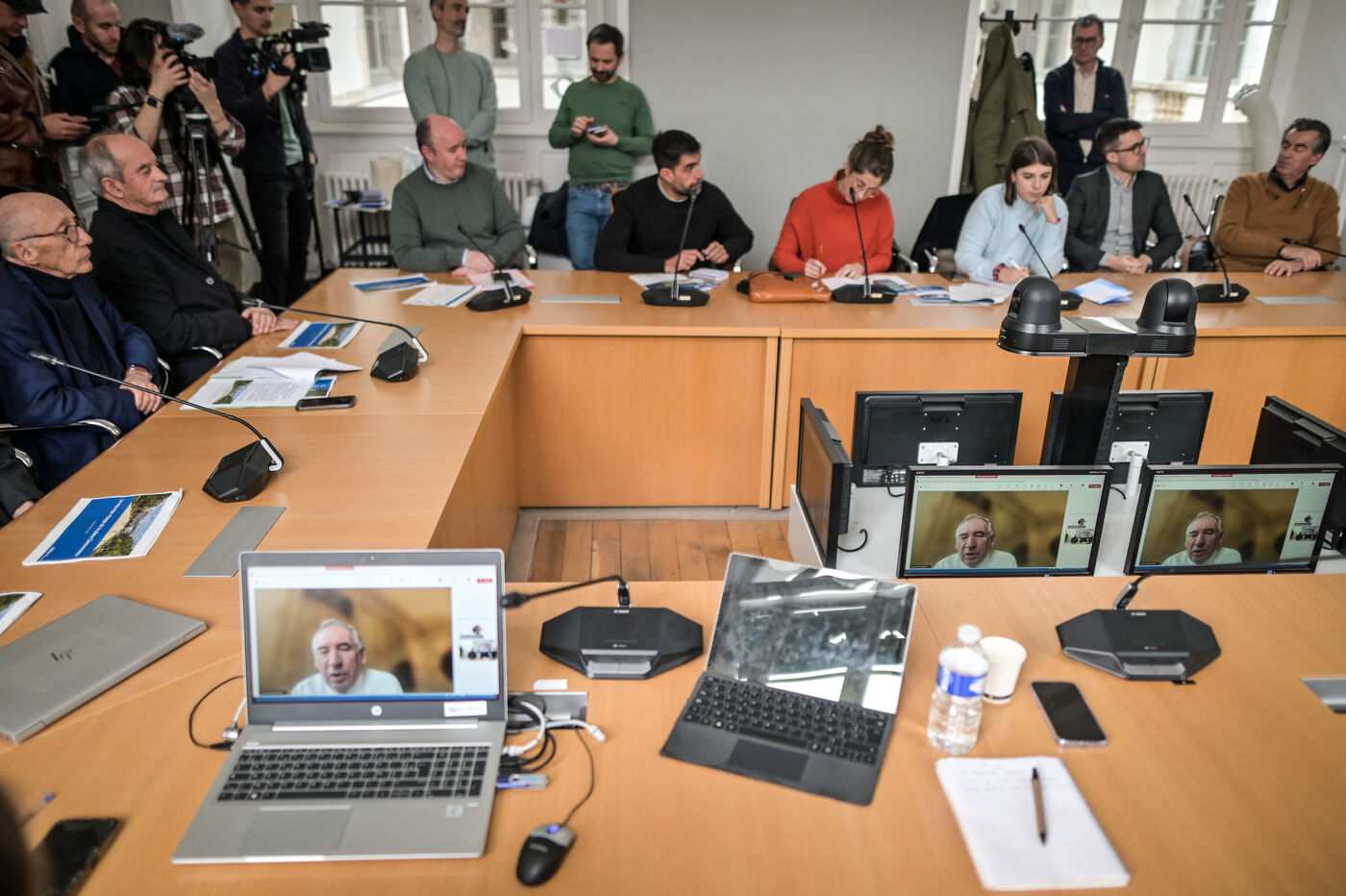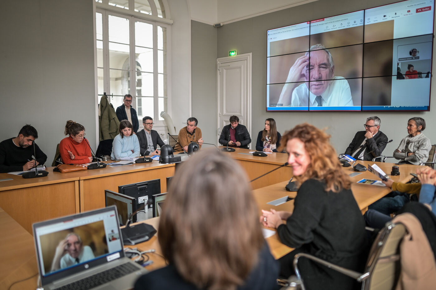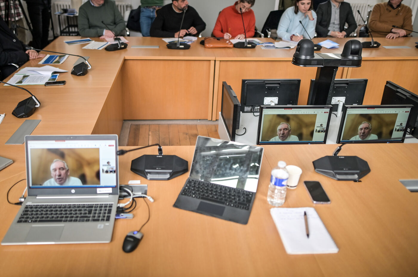 Dans la salle de reunion de la mairie de Pau Francois Bayrou presente a distance en visionconference le projet de vegetalisation de la place centrale de la ville la place clemenceau a Pau le 8 fevrier 2024. Une image qui peut illustrer le cumul des mandants, l omnispresence du premier ministre. Ce dernier a refuse de repondre aux questions concernant le droit du sol et le scandale de Betharram. Il a en revanche reagit sur les propos du point qui parle de "caprice"lorqsqu'il evoque les pressions faites par Bayrou envers Air france concernant la ligne Pau Orly