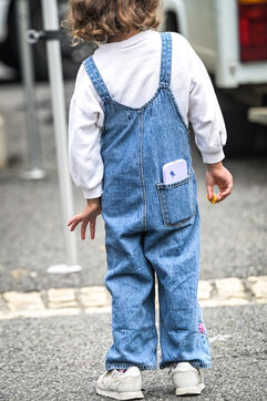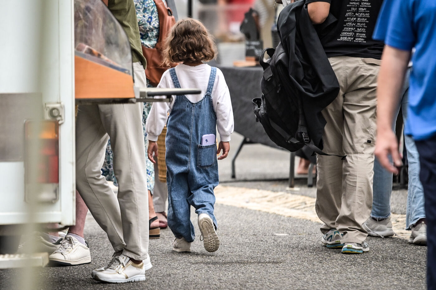 Un enfant en salopette en jean et baskets blanches marche dans un marché à Navarrenx le 27 aout 2025. Dans sa poche arrière, un smartphone dépasse, symbole de l’omniprésence du téléphone portable et du numérique dès l’enfance. Cette scène de rue illustre la vie quotidienne, la mixité générationnelle et les usages précoces des écrans. À travers cette image de marche et de dos, on perçoit l’enfance connectée, le lien entre société et technologie, au cœur de la ville et de l’espace urbain.