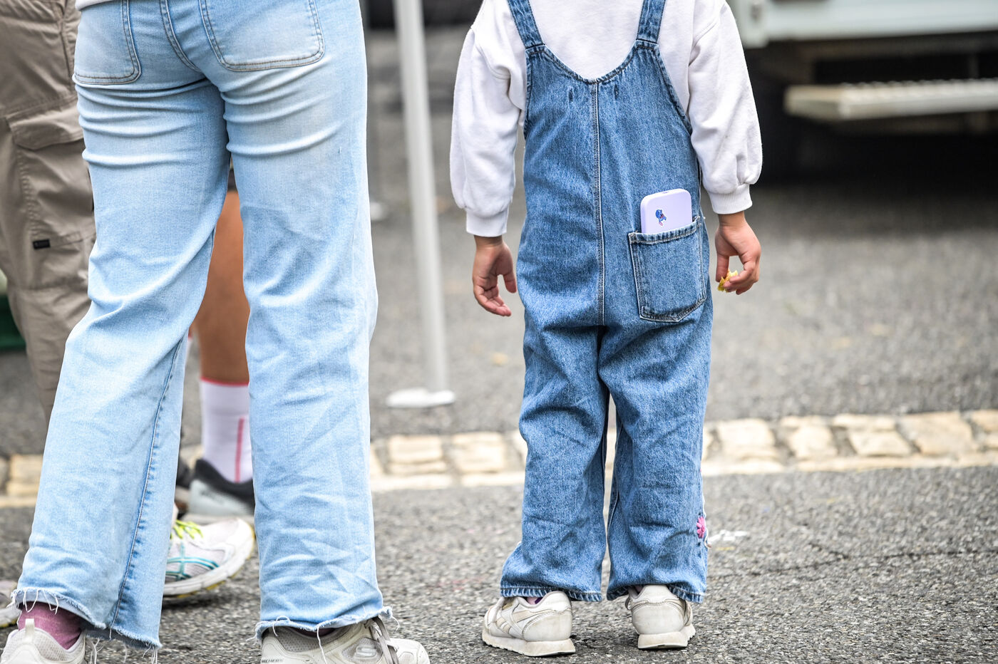 A child in denim overalls and white sneakers walks through a market in Navarrenx on August 27, 2025. A smartphone protrudes from his back pocket, symbolizing the omnipresence of cell phones and digital technology from childhood. This street scene illustrates daily life, generational diversity, and early screen use. Through this image of walking and a view from behind, we perceive connected childhood, the link between society and technology, at the heart of the city and urban space.
