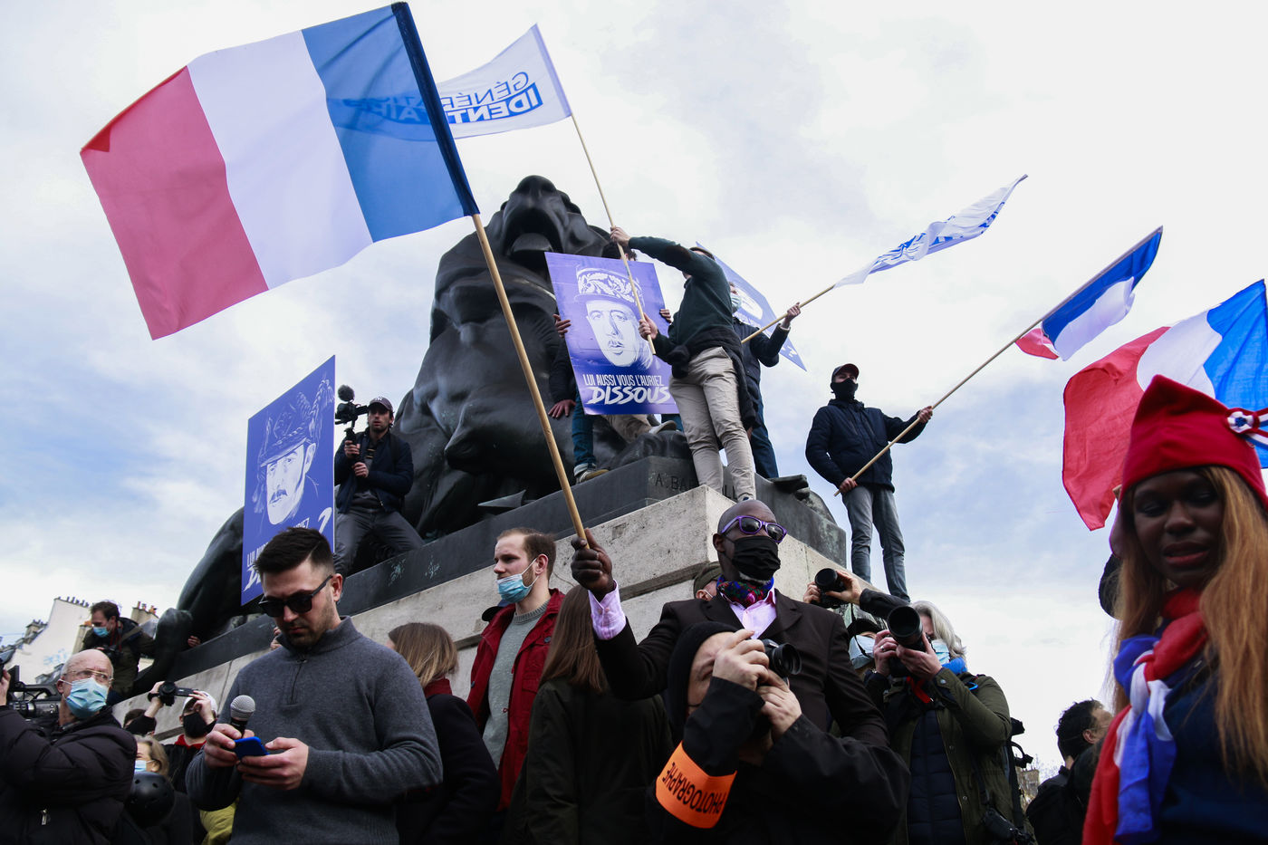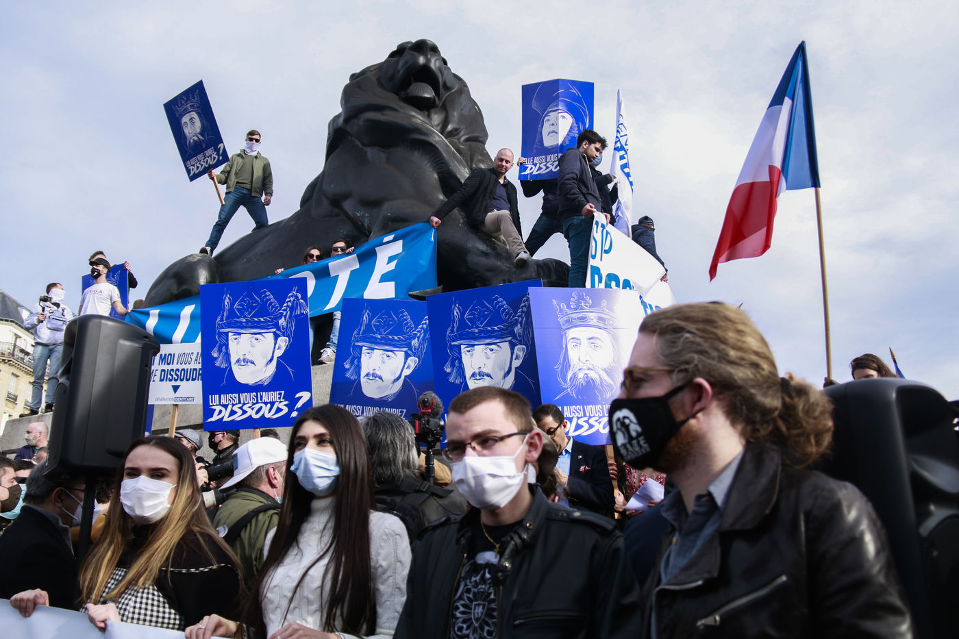 Les militants de Génération Identitaire se sont rassemblés à Paris, place Denfert-Rochereau pour protester contre la dissolution de leur mouvement décreté par Gerald Darmanin.
