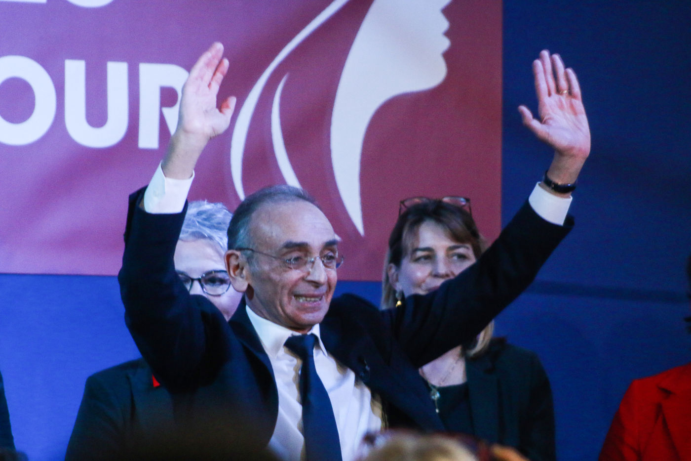 Reconquete candidate Eric Zemmour gives a speech to his activists on Women's Day through the collective "Women with Zemmour" on March 8, 2022 in Saint-Mande.