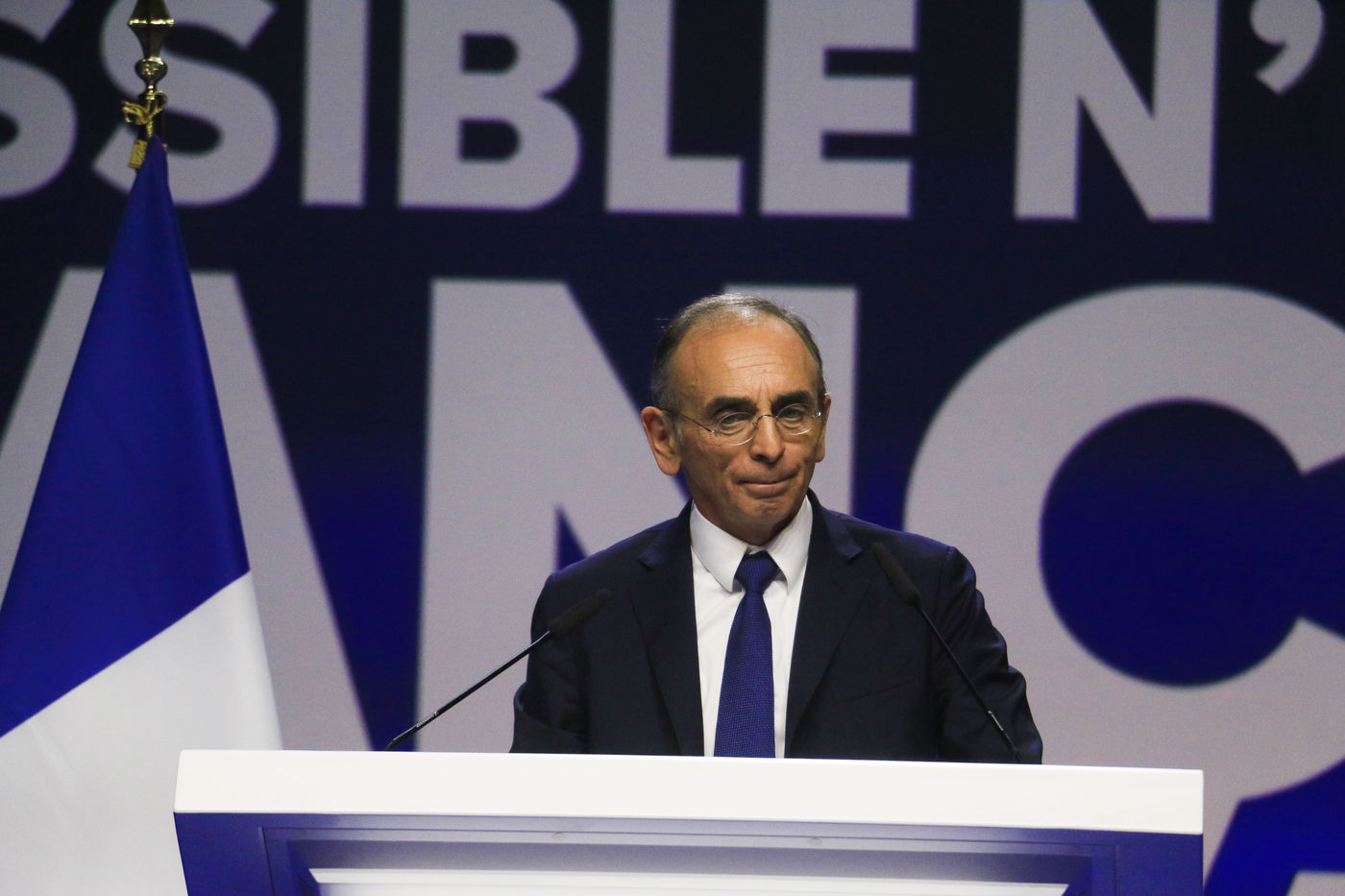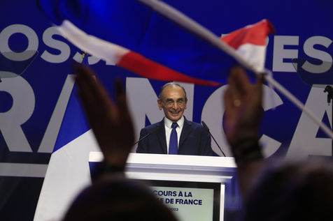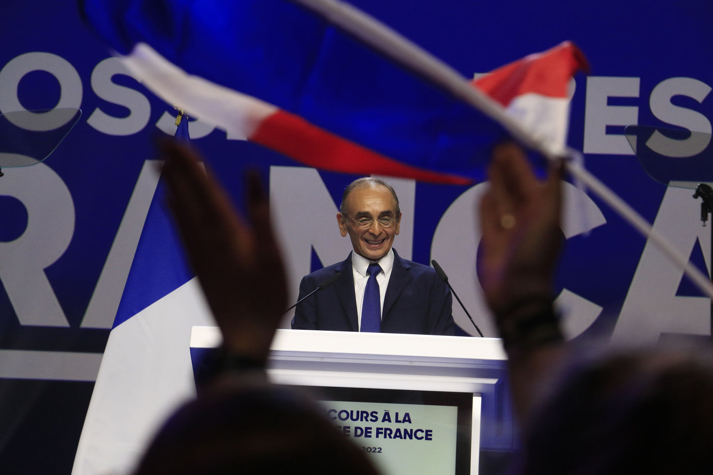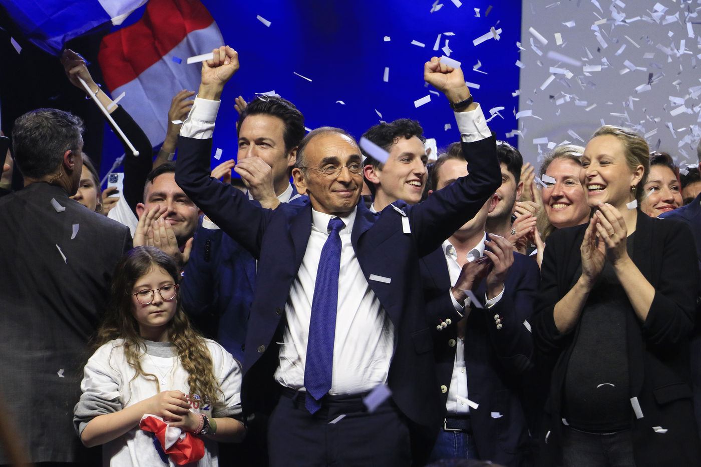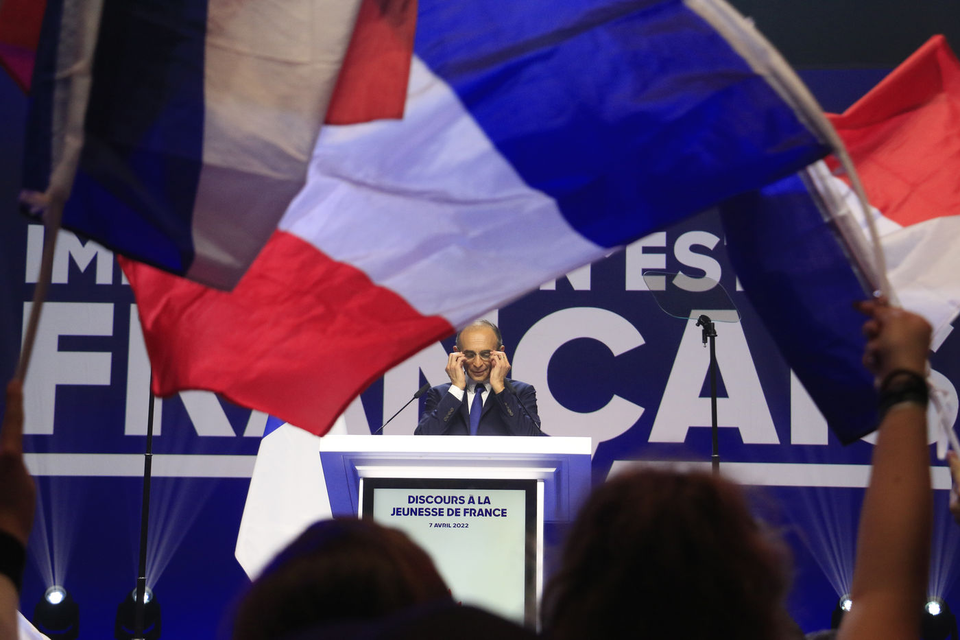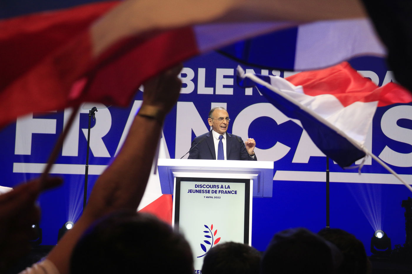 France, 2022-04-07. The Reconquete party candidate Eric Zemmour during his last campaign meeting with the collective Les Jeunes avec Zemmour at the Palais des Sports. Photograph by Quentin de Groeve / Hans Lucas