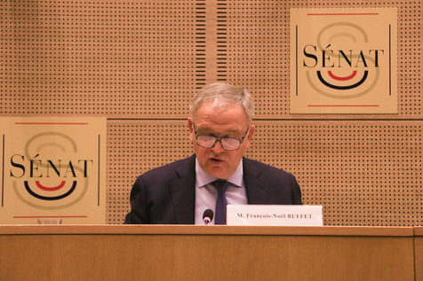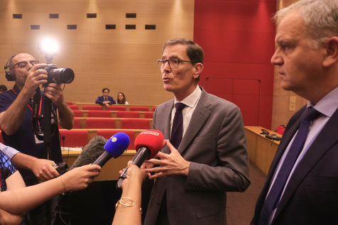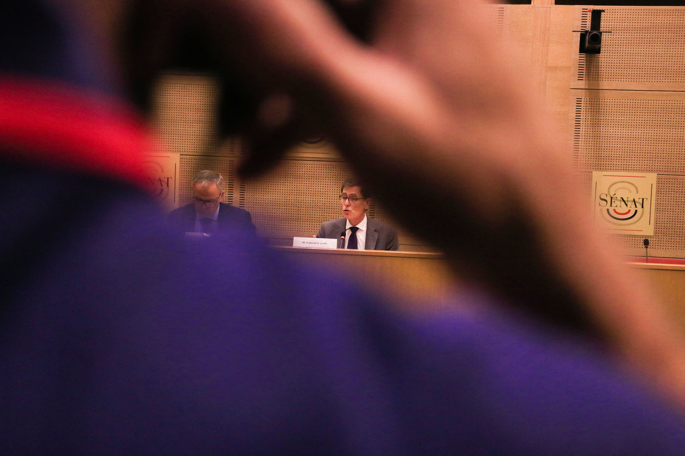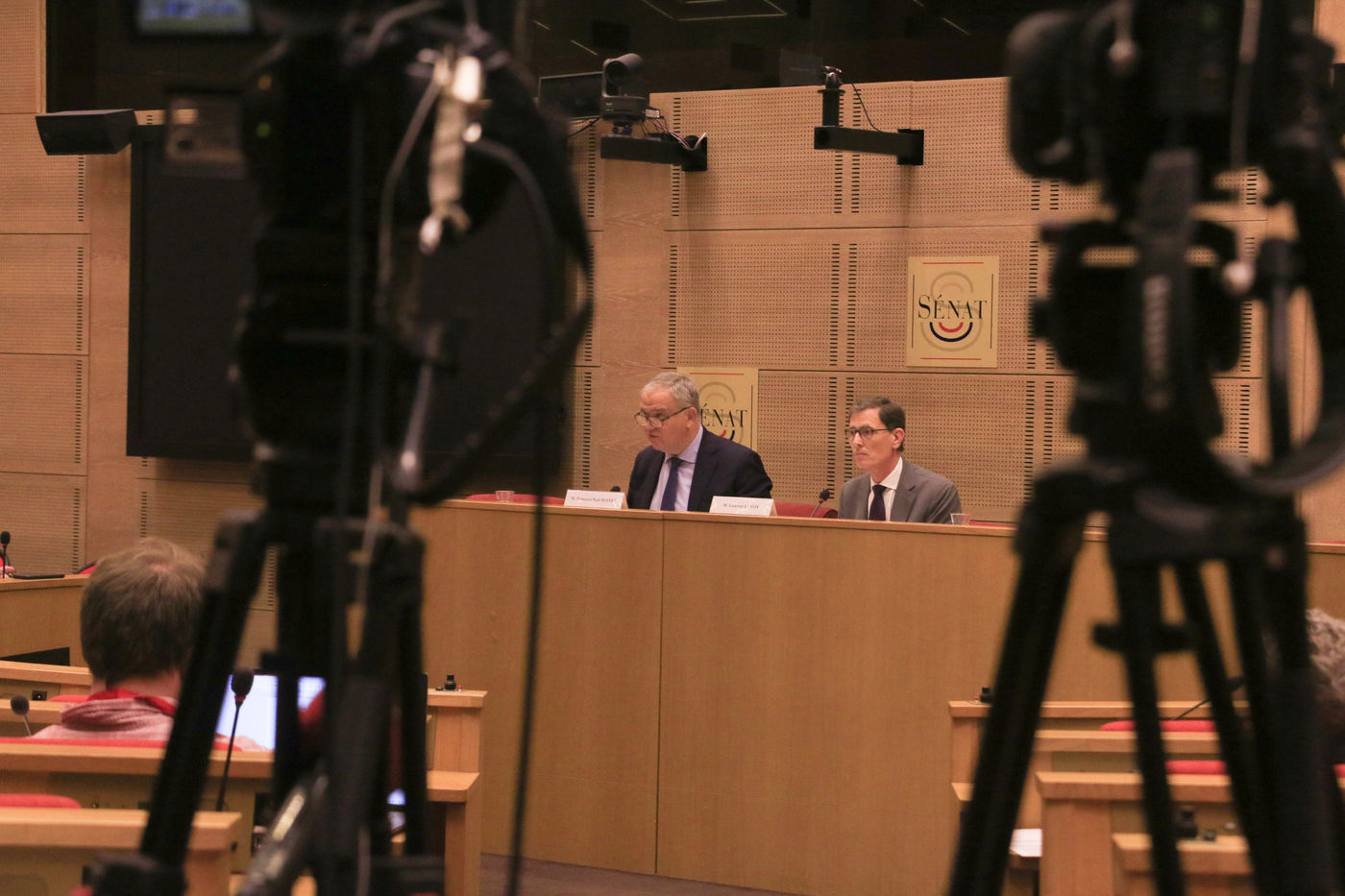 France, 2022-07-13. Francois-Noel Buffet and Laurent Lafon give a press conference for the conclusion of the report on the incidents at the Stade de France. Photograph by Qentin de Groeve / hans Lucas