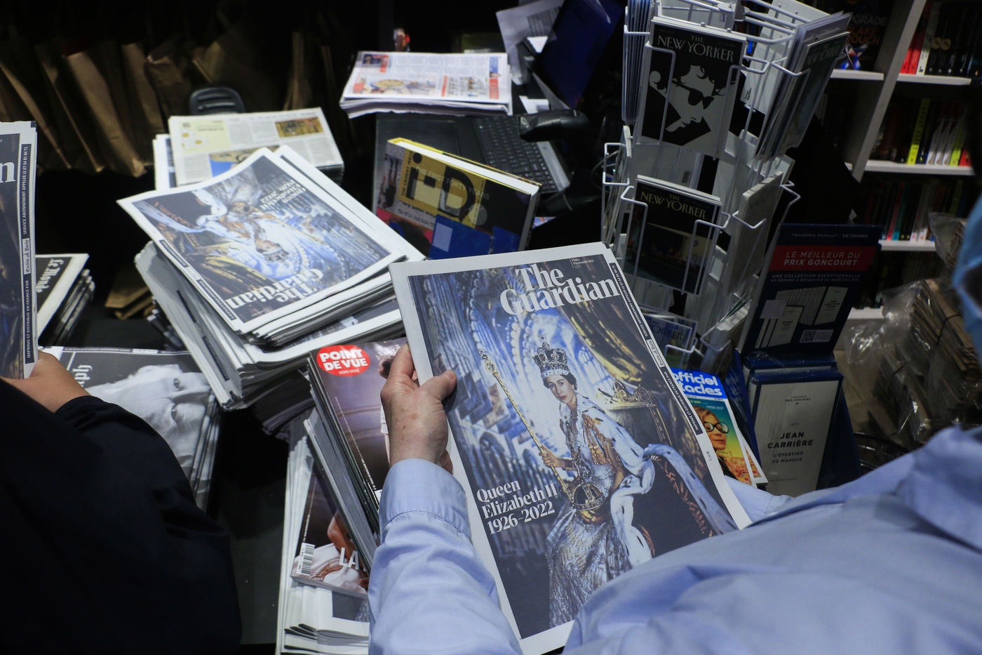 France, Paris, 2022-09-11. Two days after the death of Queen Elizabeth II, the English bookstore Smith & Son is still selling British newspapers dedicated to her memory. Photograph by Quentin de Groeve / Hans Lucas