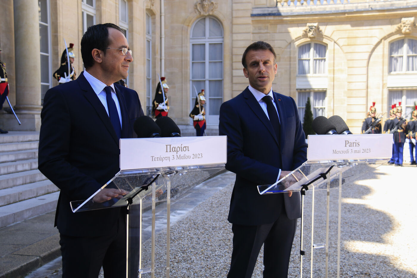 France, Paris, 2023-05-03. French President Emmanuel Macron and the President of Cyprus Nikos Christodoulides at the Elysee Palace. Photograph by Quentin de Groeve / Hans Lucas