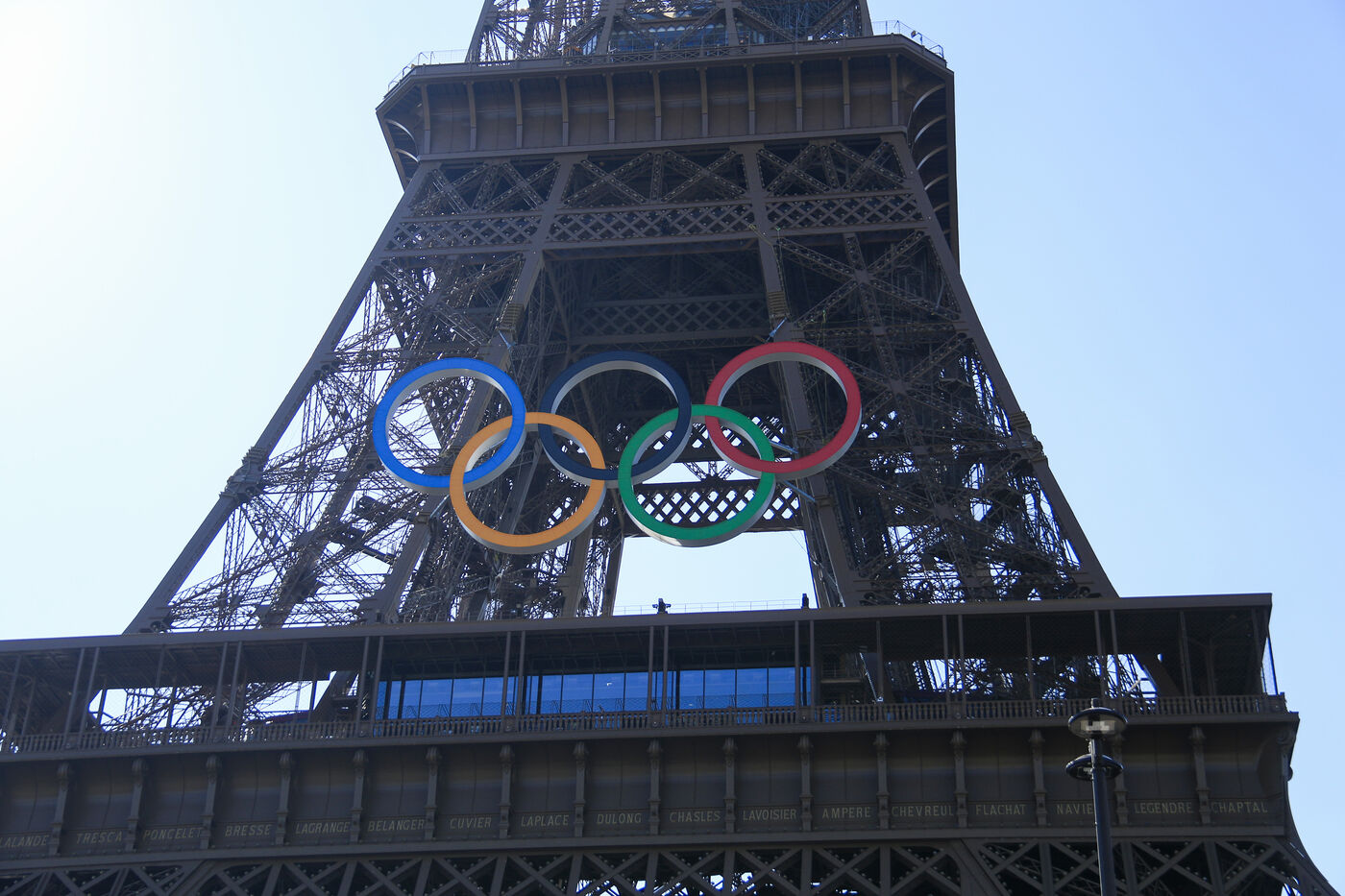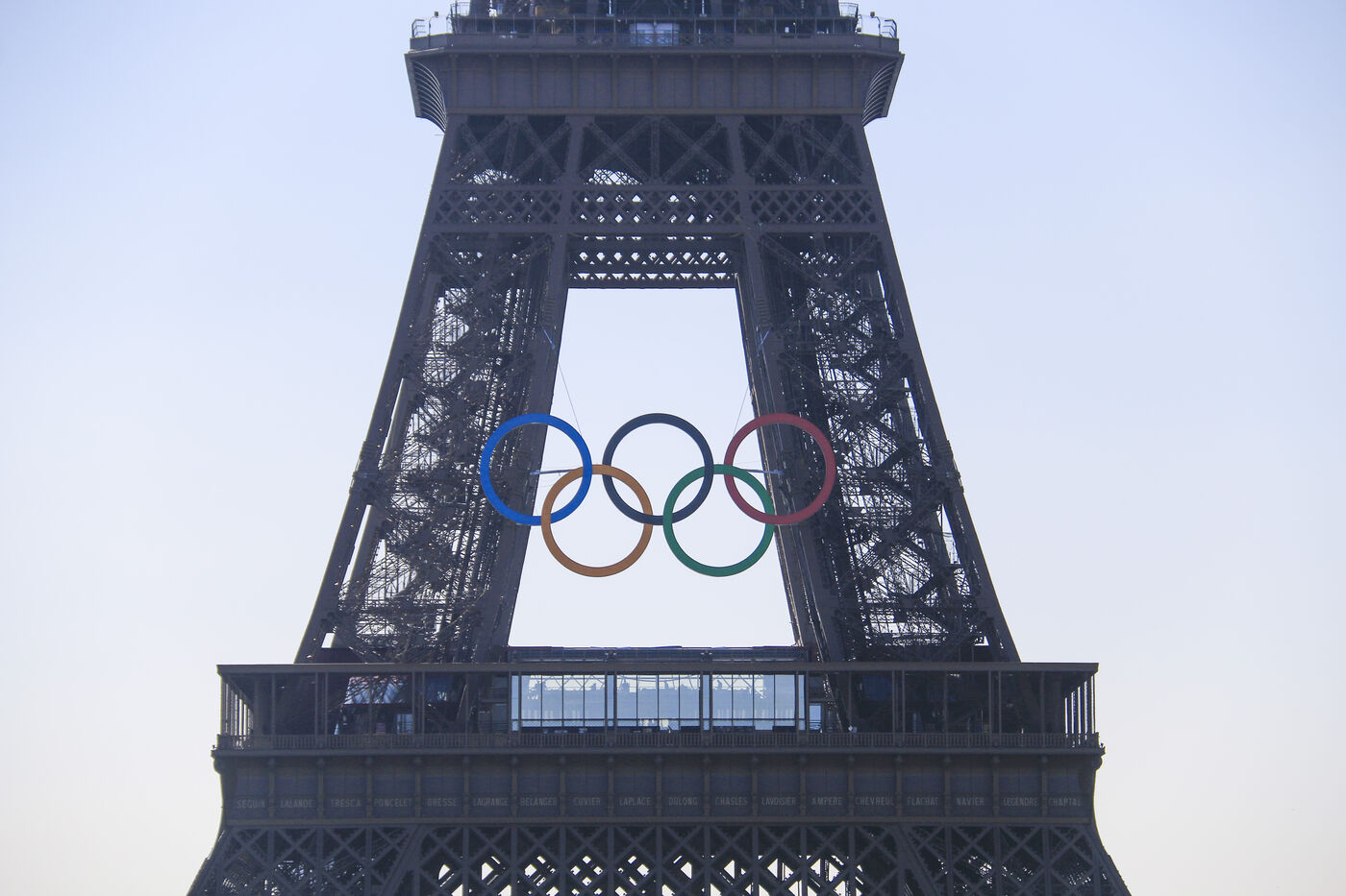 The Olympic rings were installed on the Eiffel Tower for the 2024 Games in Paris on June 7, 2024.