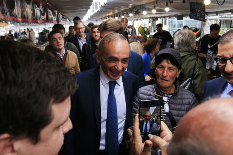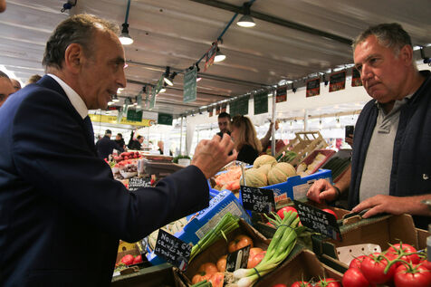 Eric Zemmour and Reconquete candidate for the legislative elections Jean Messiha visiting the Neuilly market in Hauts-de-Seine on June 19, 2024.