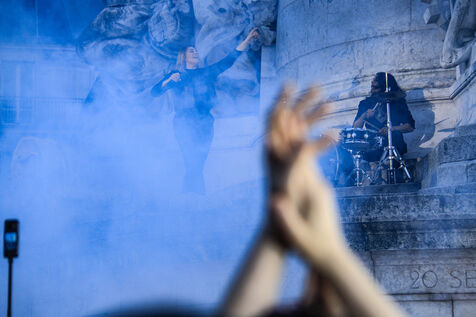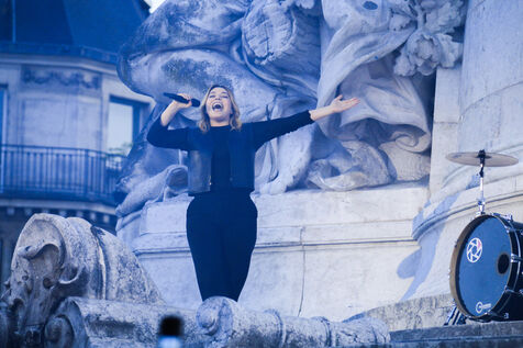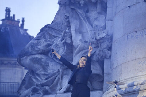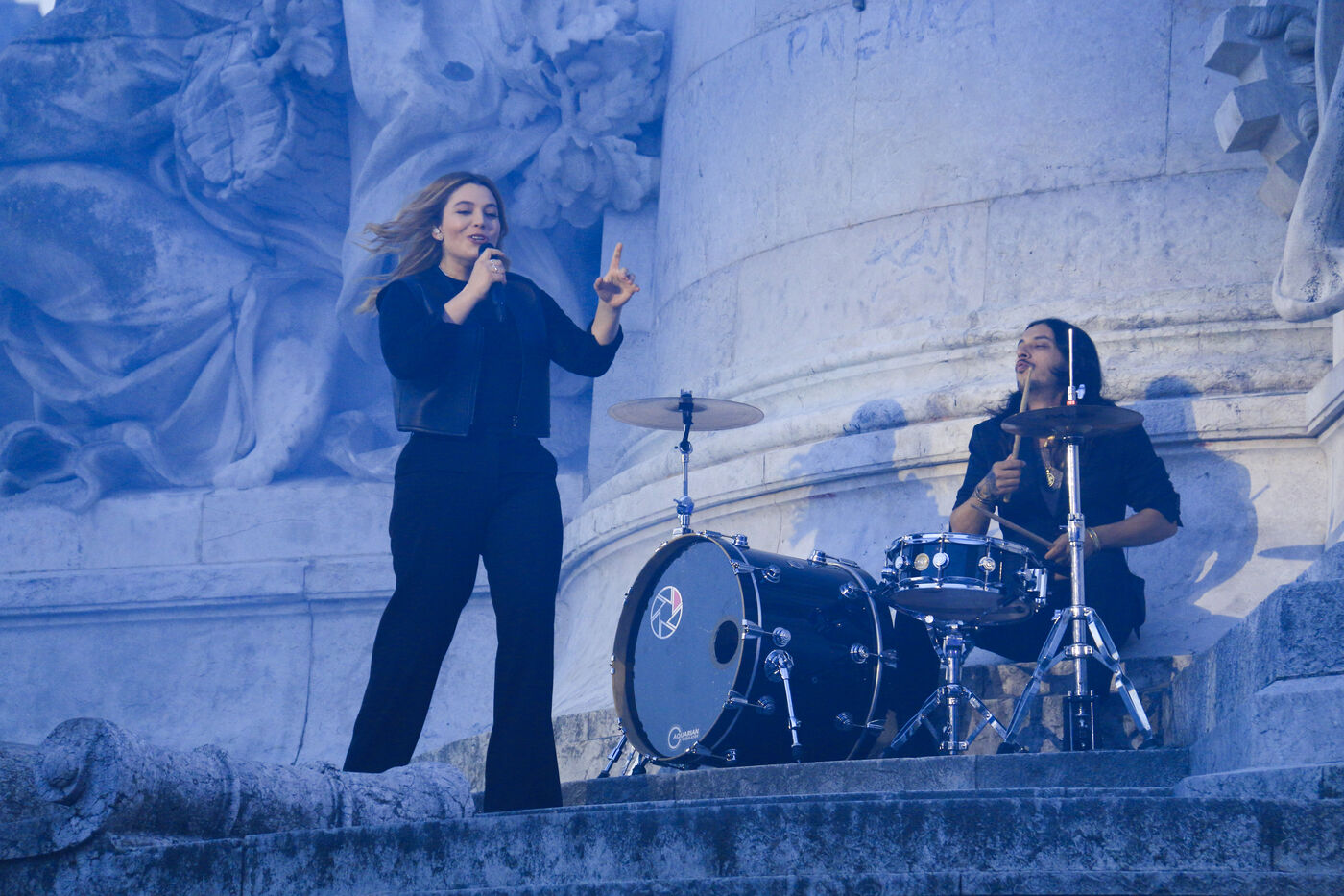 The singer Santa in concert on the statue at Place de la Republique to celebrate the Olympic torch relay in Paris on July 15, 2024.