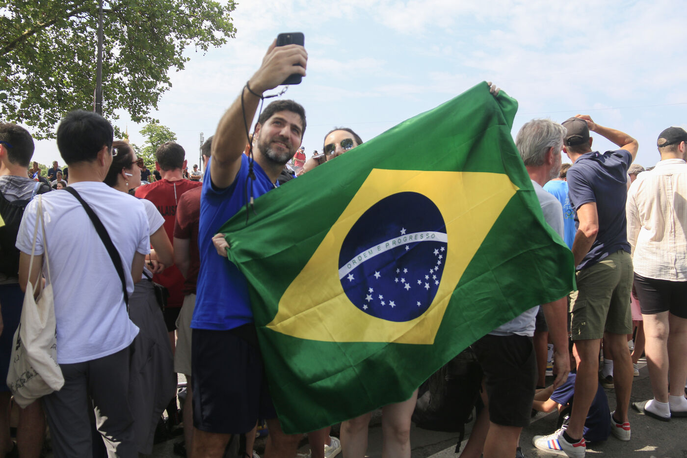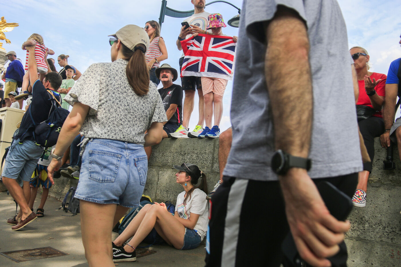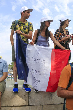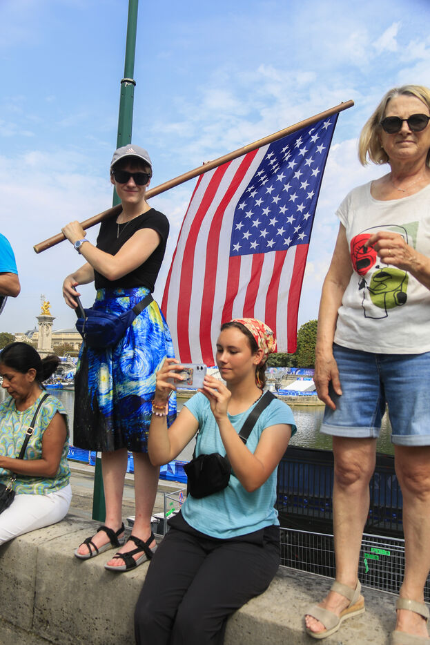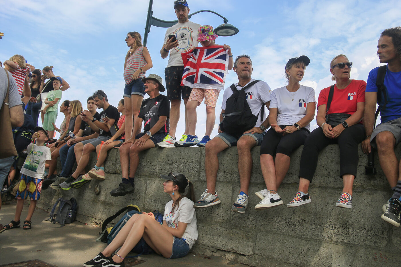 Supporters during the Men's Triathlon at the Quai d'Orsay for the Olympic Games in Paris on July 31, 2024.
