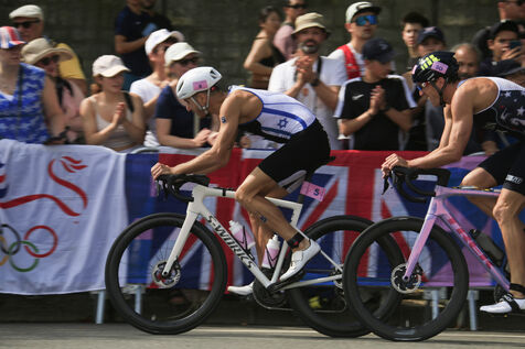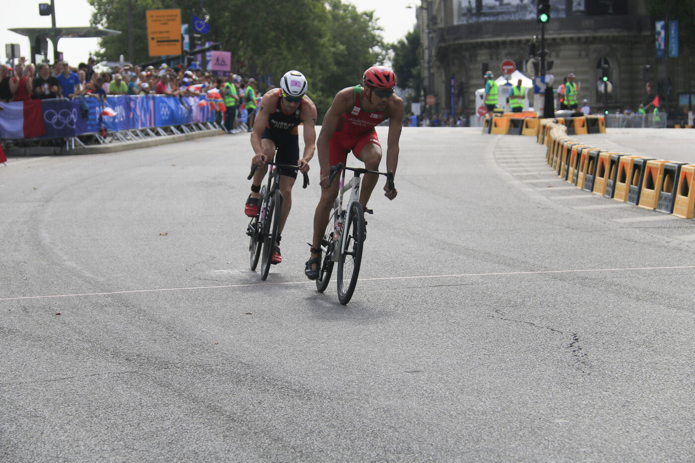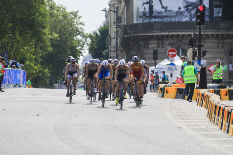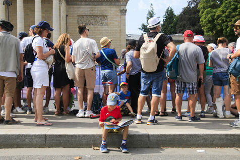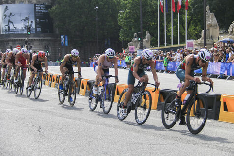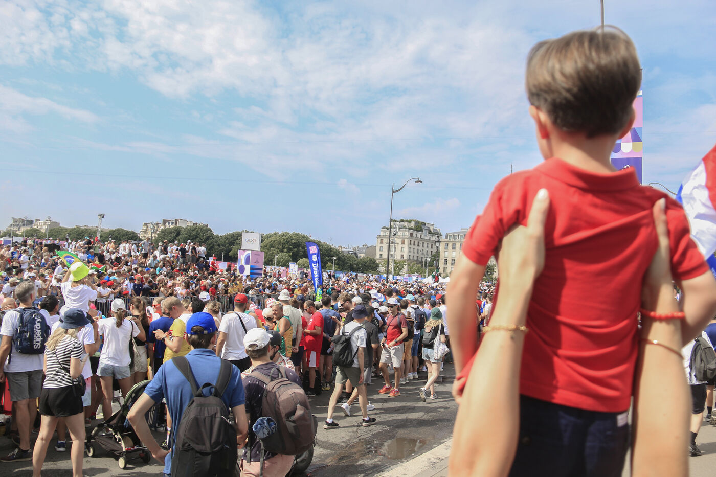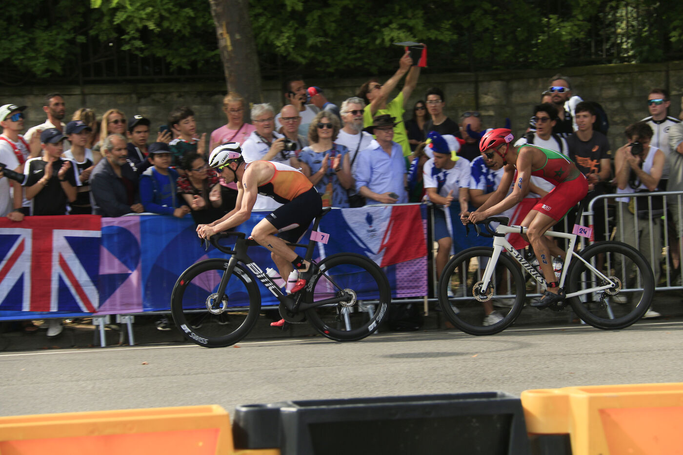 Supporters during the Men's Triathlon at the Quai d'Orsay for the Olympic Games in Paris on July 31, 2024.