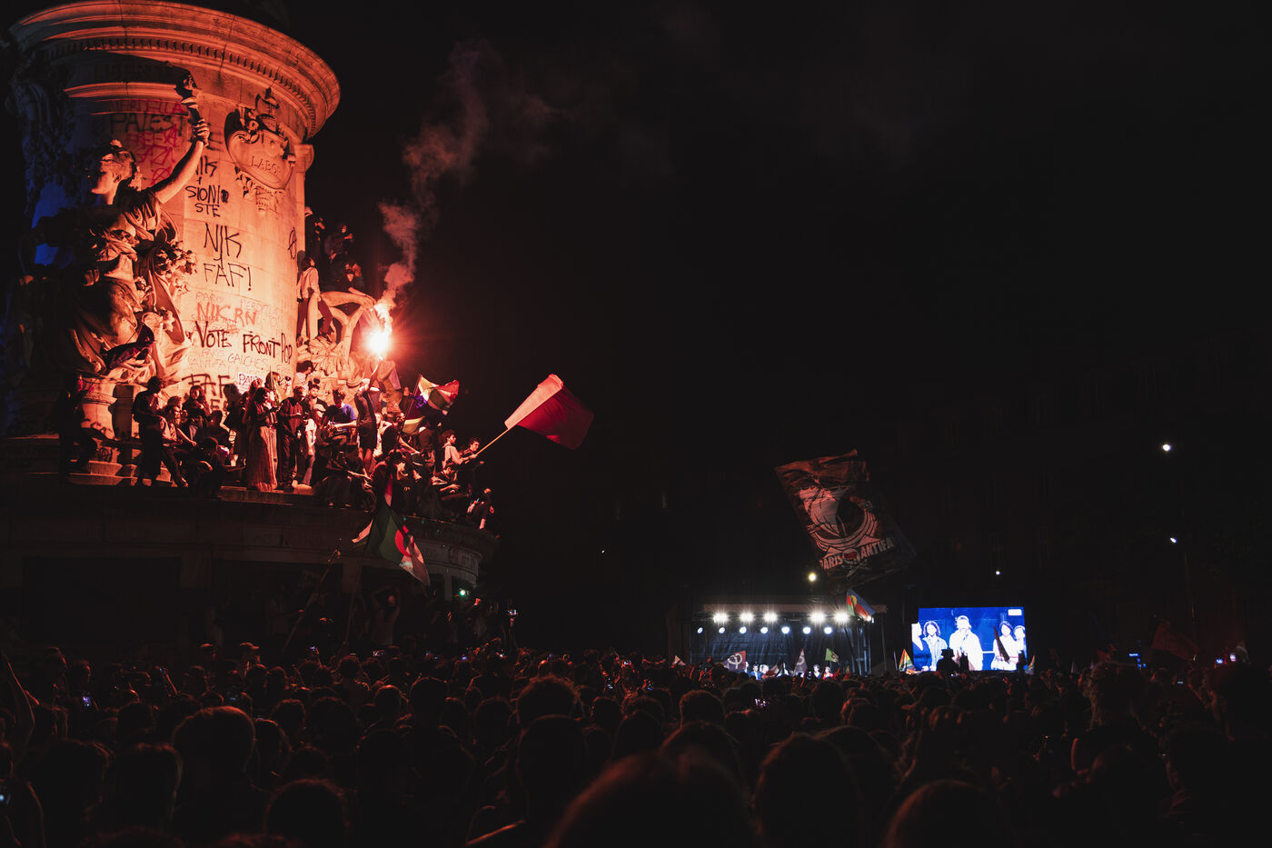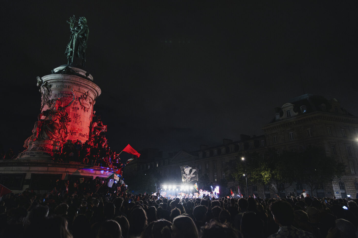 Rassemblement de l'union de la gauche sur la place de la République à Paris après les résultats du 1er tour des éléctions legislatives 2024.
