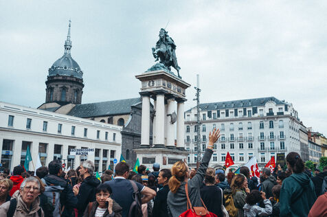 Gathering called by several left-wing organizations and the NFP (Nouveau Front Populaire) following the appointment as Prime Minister of Michel BARNIER (LR Les Républicains) by Emmanuel MACRON at Place Jaude in Clermont-Ferrand in the Auvergne département of France on September 7, 2024.