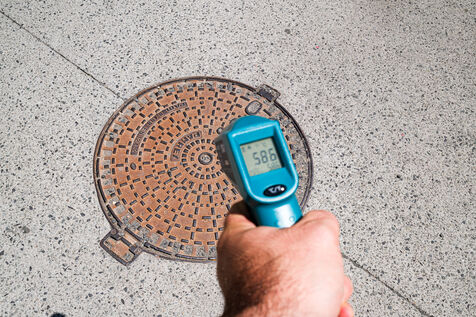Sous le soleil écrasant, les matériaux de la ville révèlent des écarts frappants : 58,6°C sur une plaque d’égout, 55,8°C sur un trottoir, 47,5°C sur une pierre, contre à peine plus de 10°C à la surface d’une fontaine. Ces images témoignent de la surchauffe des surfaces urbaines, un phénomène amplifié par l’absence de végétation et la prédominance de revêtements minéraux.