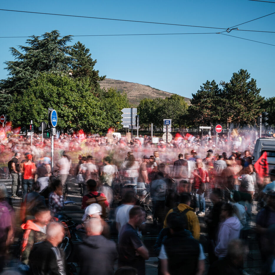 Cette série photographique a été réalisée avec un filtre ND et un temps de pose long, lors d’une journée de mobilisation intersyndicale contre les politiques sociales et économiques du gouvernement, rejointe par le mouvement "Bloquons Tout" à Clermont-Ferrand. En captant le flou des corps en mouvement, les images traduisent visuellement la force collective et la persistance du geste protestataire dans l’espace urbain.