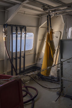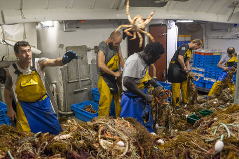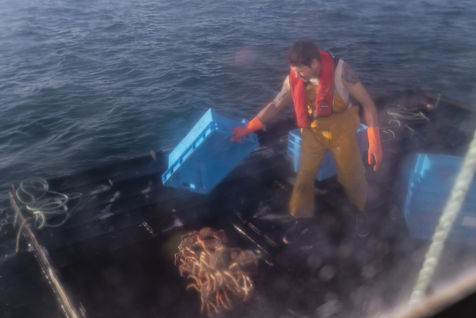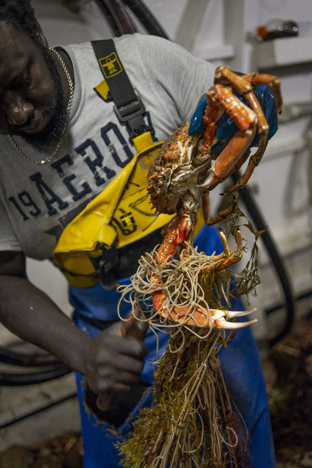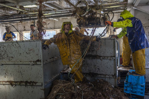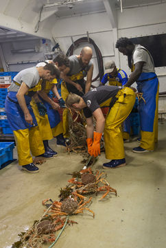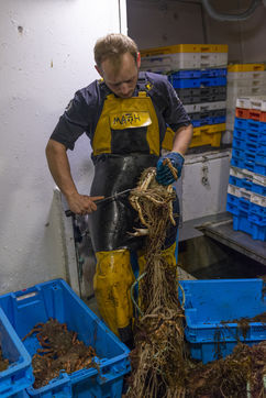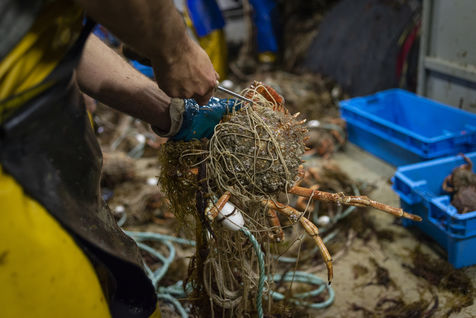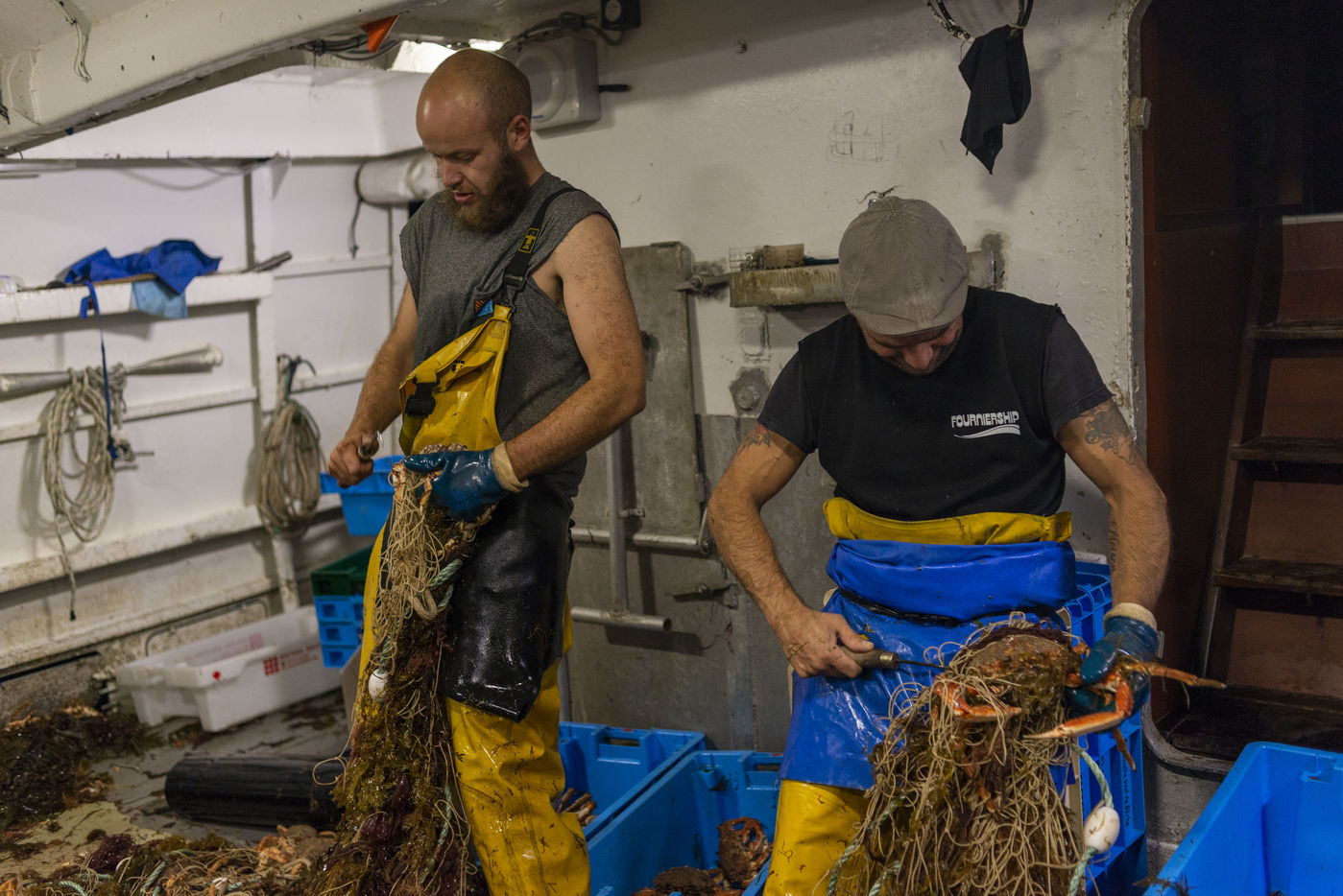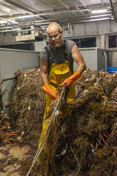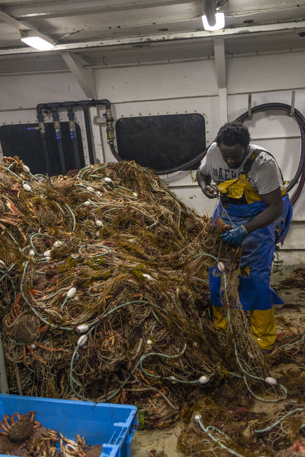 Spider crab's fishing is done with nets, we put down nets of two times 2 kilometers that we come to recover a few days later. The spider crab gets caught in the net and twisted, then it is up to the fishermen to remove them with a tool also called gutter. It is a tiring work, one repeats the same gestures, which in the long run can generate chronic tendinitis while lifting heavy loads. It is a chain job on a boat in the open sea, constantly tossed by the swell. The boat does not leave for more than a day, it returns to port once the objective has been reached.