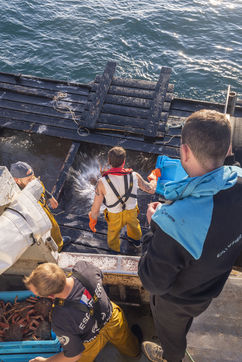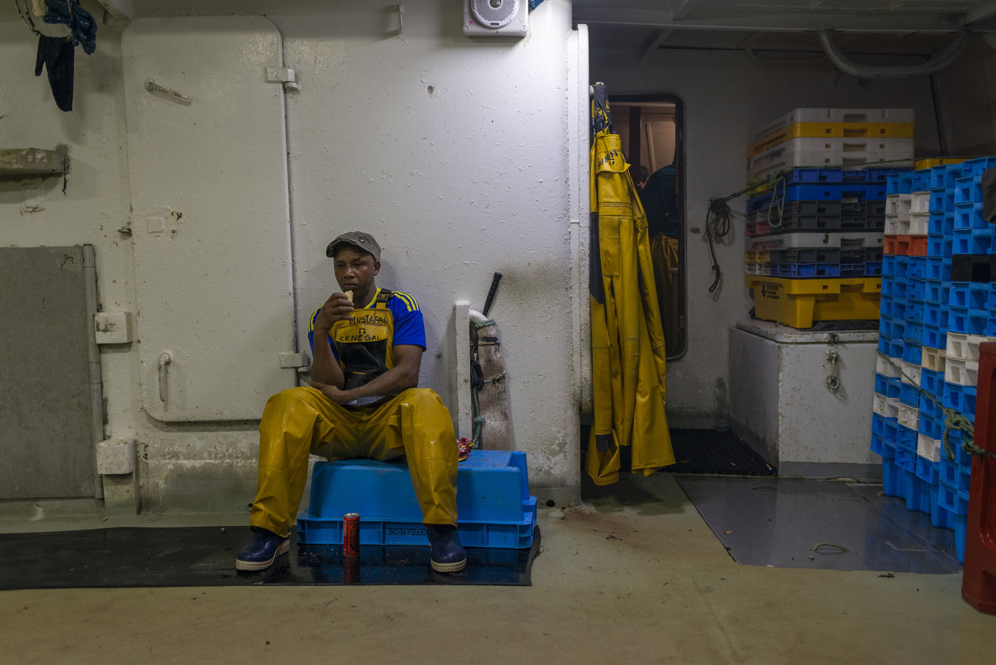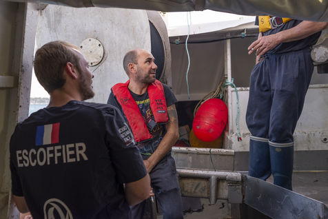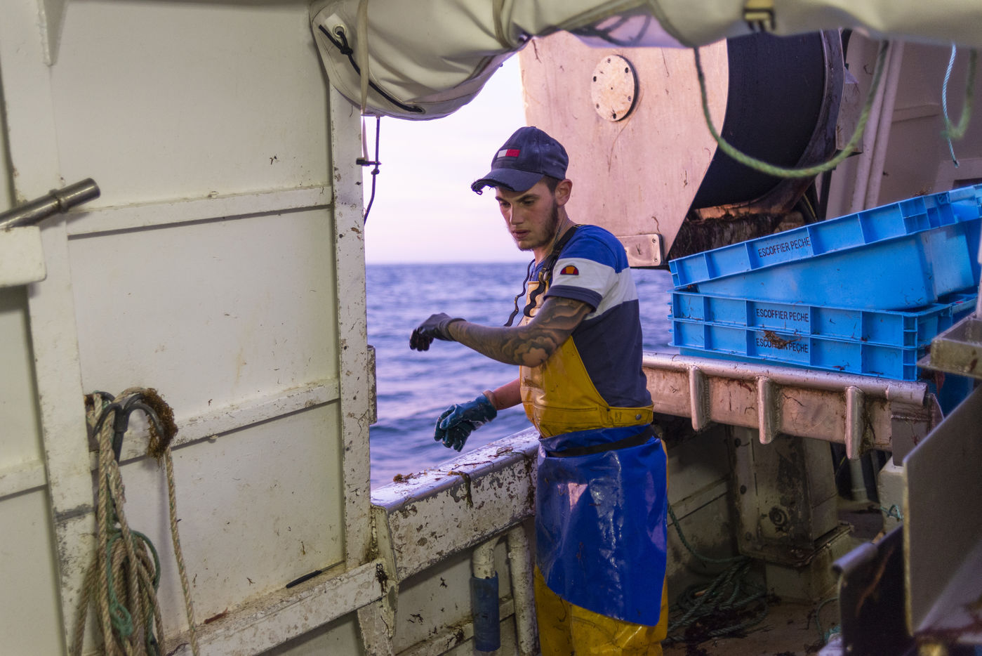 They are 9 on board. The youngest, Matthieu, just in his twenties, learns the trade from Nelson, the boat's second mate. He is Portuguese like Augusto and Abel who settled in Saint-Malo attracted by higher wages than in the country. Moussa, the oldest is 50 years old but looks 20 years younger, he comes from Senegal like Ousmane, they have been part of the crew for several years now. Coin-coin, the mechanic is from Saint-Malo like Michaël the thirty-something who has been in the business for 10 years now and hopes to buy his own boat soon.