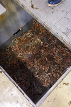Compte tenu de l'expertise du capitaine, le volume des ventes et donc celui de la prise est anticipé. Aujourd'hui, c'est une petite vente qui est prévue, aux alentours de 500 kilos cependant, Maxime envisage de rapporter pas moins de 2 tonnes ! Le surplus d'araignées est stocké dans des viviers au mouillage. Les araignées sont réparties en fonction de leur sexe. Les mâles, plus gros et donc plus recherchés se vendent mieux que les femelles pourtant davantage charnues, aux dires des connaisseurs.
