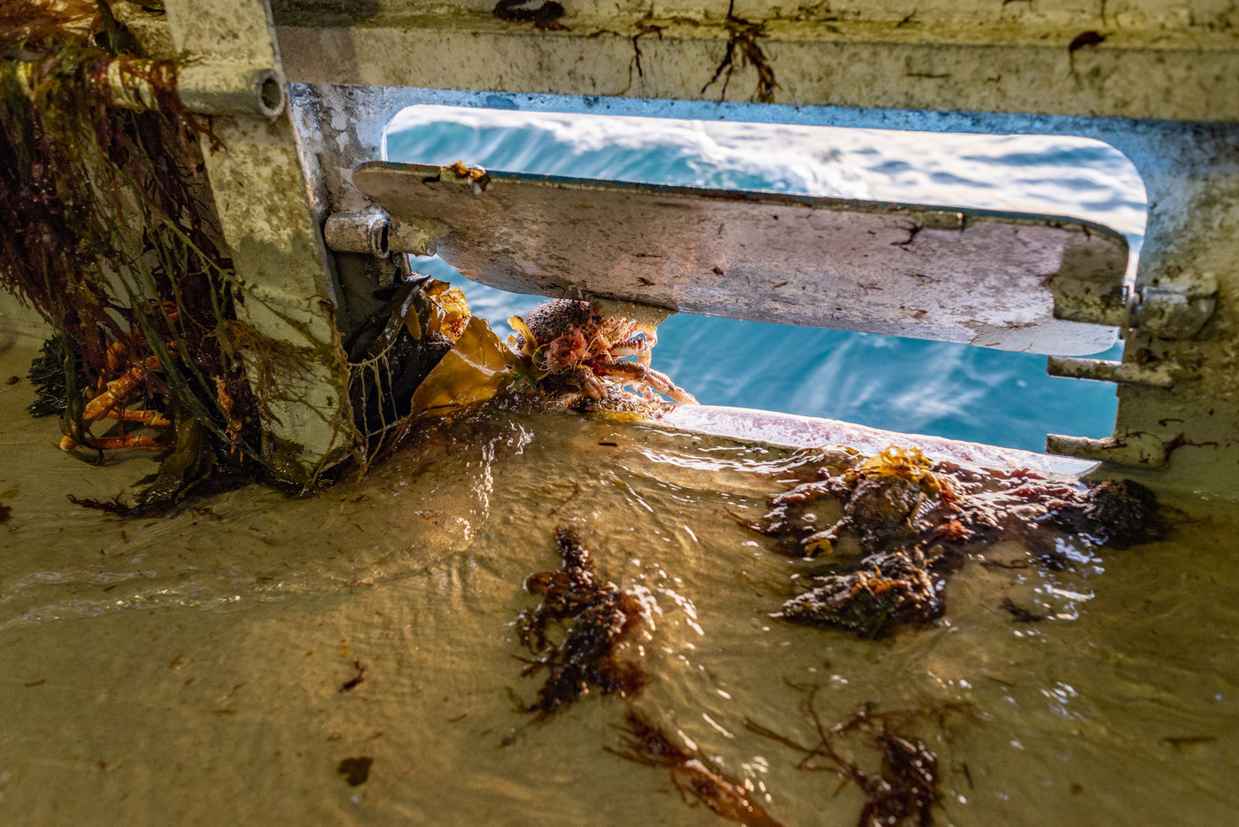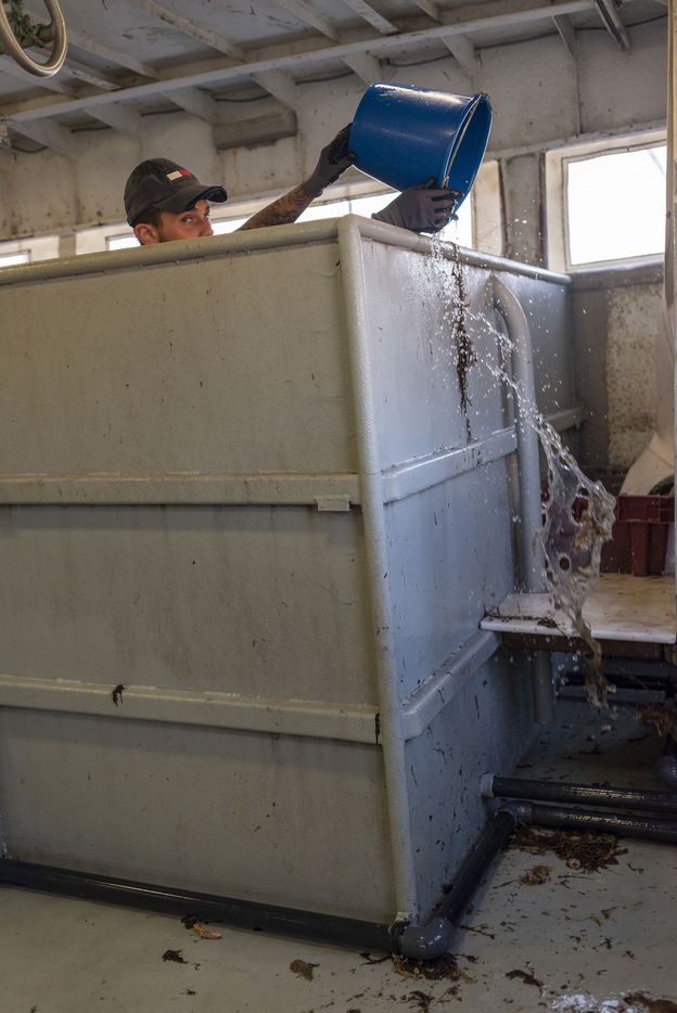 That morning, we returned to the port at 8 am, but we still had to empty the spider crab-filled tanks into the fish tanks and prepare the day's sale. Two vans are waiting for their order. Then of course, to clean the boat and remove the seaweed stuck in the nets. At 10:30 a.m. the day is over. Maxime gives them an appointment for 8pm that same evening. Tomorrow a big buyer comes to collect 5 tons of males.