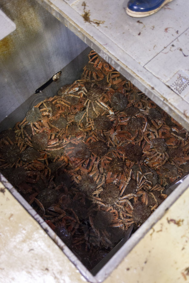 Given the expertise of the captain, the volume of sales and therefore the volume of the catch is anticipated. Today, it is a small sale which is planned, around 500 kilos however, Maxime plans to bring back no less than 2 tons! The surplus of spider crabs is stored in fish tanks at anchor. The spider crabs are distributed according to their sex. The males, larger and thus more sought-after, sell better than the females yet more fleshy, according to connoisseurs.
