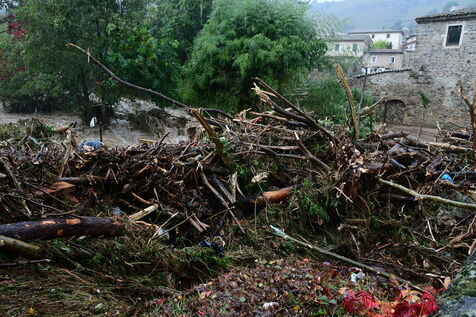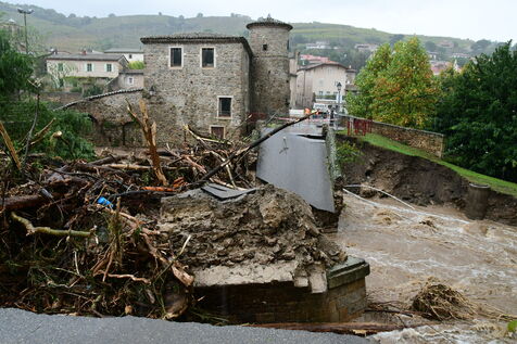 France, Chavanay, 2024/10/17. Red alert for floods and flooding in the Loire. Collapse of the Chavanay bridge. Photograph by Romain Doucelin / Hans Lucas.