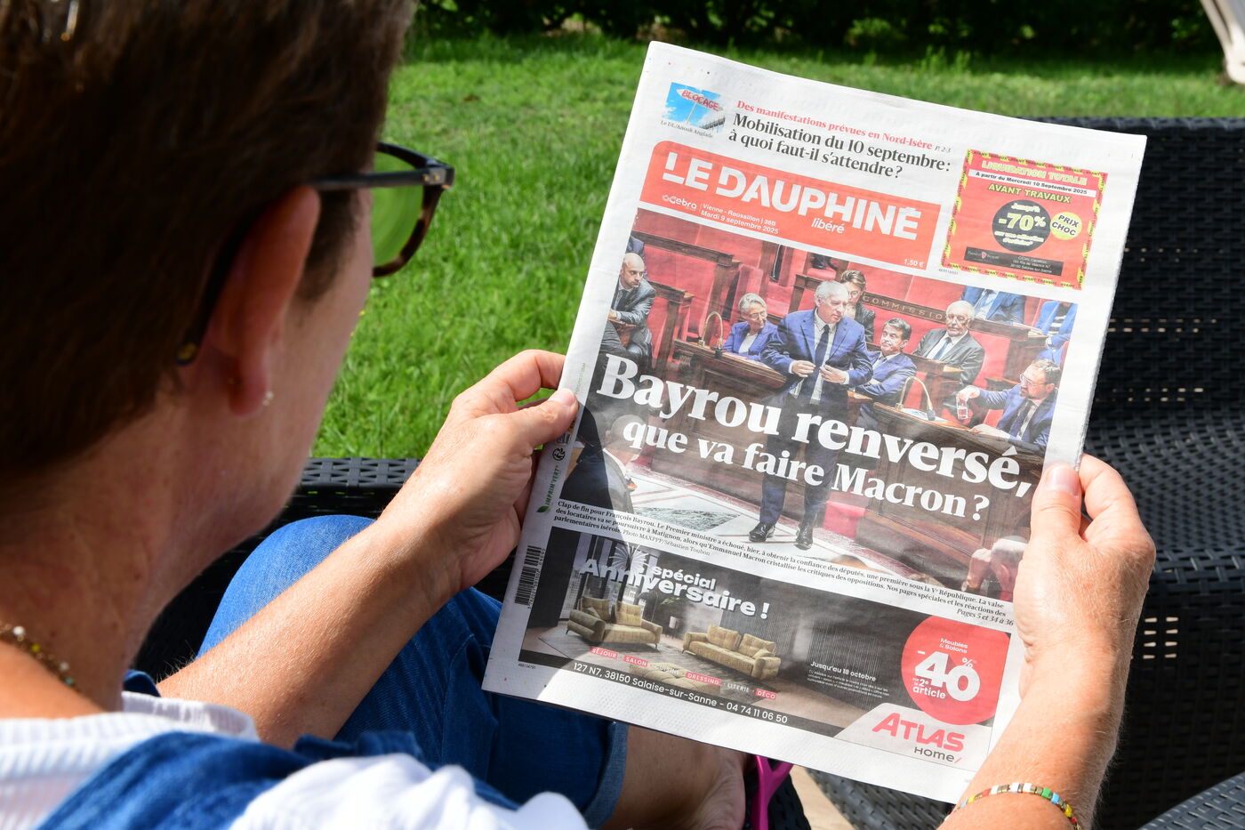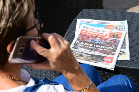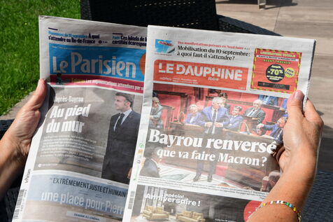 France, Clonas, 2025/09/09. Cover of the newspaper Le Dauphine Libération on the resignation of French Prime Minister François Bayrou and the end of the government. Photograph by Romain Doucelin / Hans Lucas.