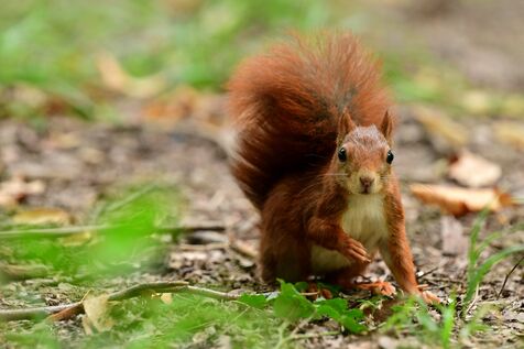 France, Lyon, 2025/09/16. Un ecureuil roux, Sciurus vulgaris, fait ses provisions pour l hiver au Parc de la tete d Or dans une foret dans la ville de Lyon. Photographie de Romain Doucelin / Hans Lucas.