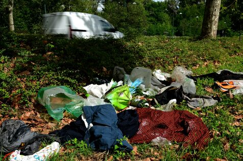 France, Lyon, 2025/09/16. Urban pollution in Lyon along a road on Boulevard Laurent Bonnevay near the Parc de la Tete d Or. Clothes on the ground. Photograph by Romain Doucelin / Hans Lucas.