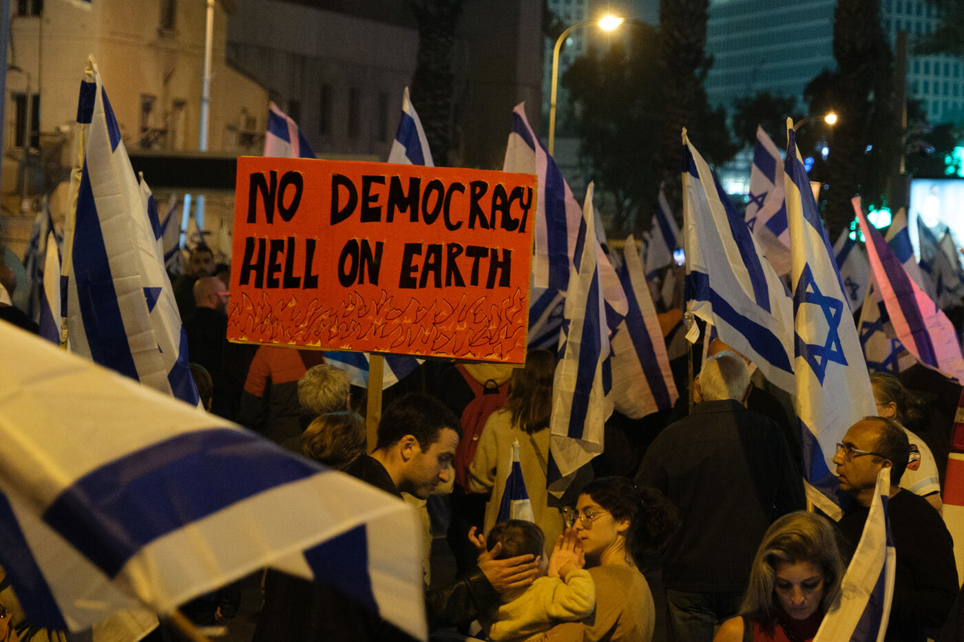 Next to Azrieli Towers, many Israeli citizens have been demonstrating for several weeks against the Prime Minister's reform of the justice system.