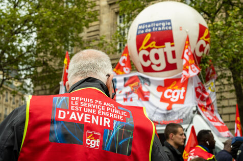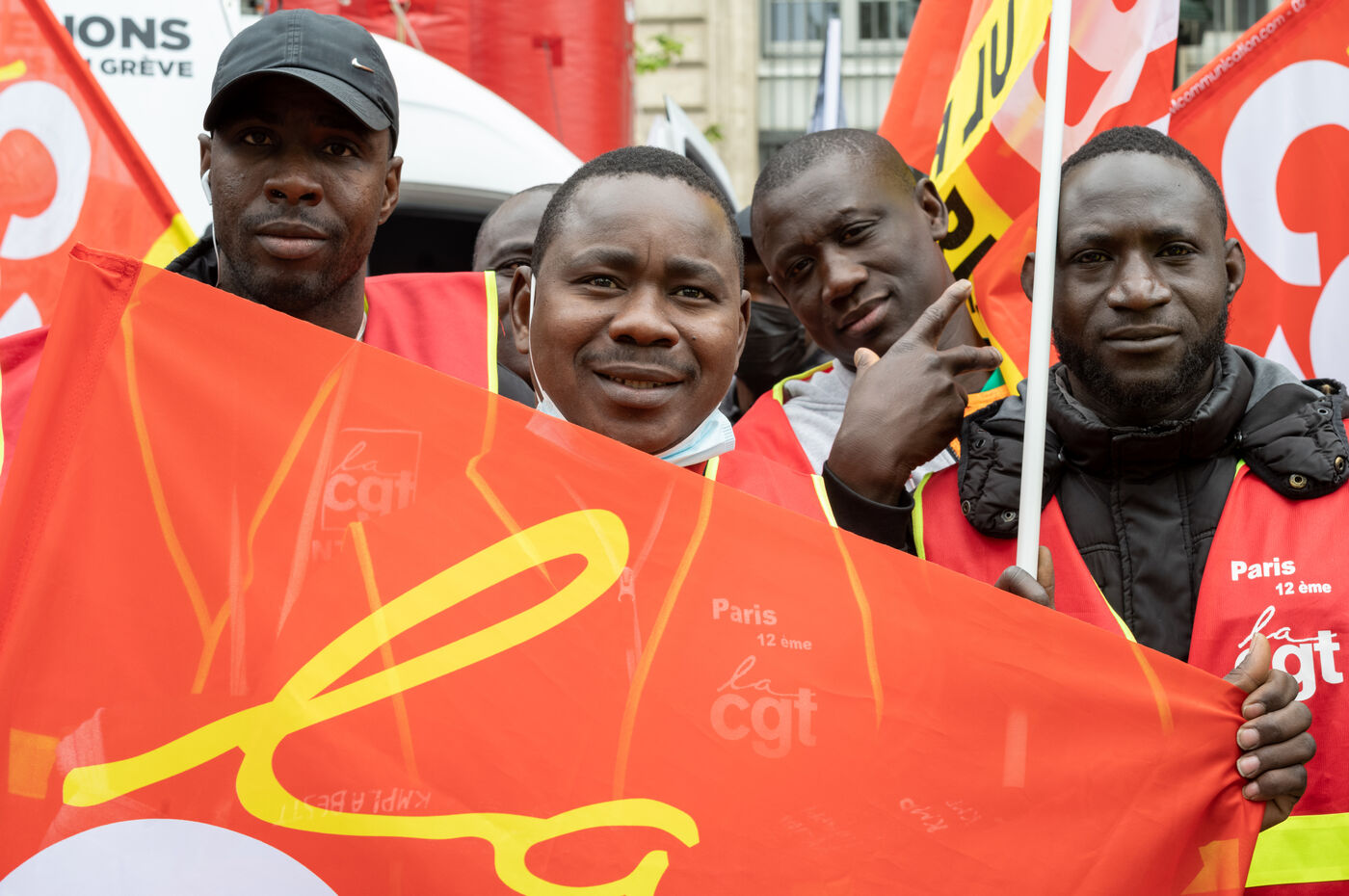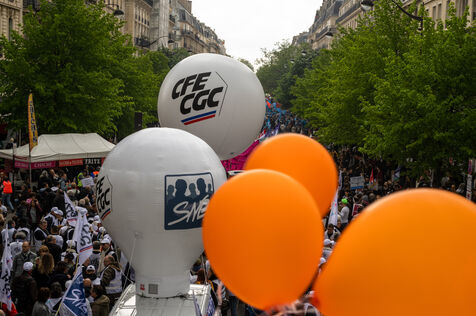 FRANCE, PARIS, 2023-05-01. May 1st demonstration for Labor Day from Place de la République to Nation called by labour inter-union and inter-professional unions CFDT, CGT, FO, CFE CGC. Demonstrators consider the retirement reform at age 64 and the need for pay raise should be the main focus of the government.